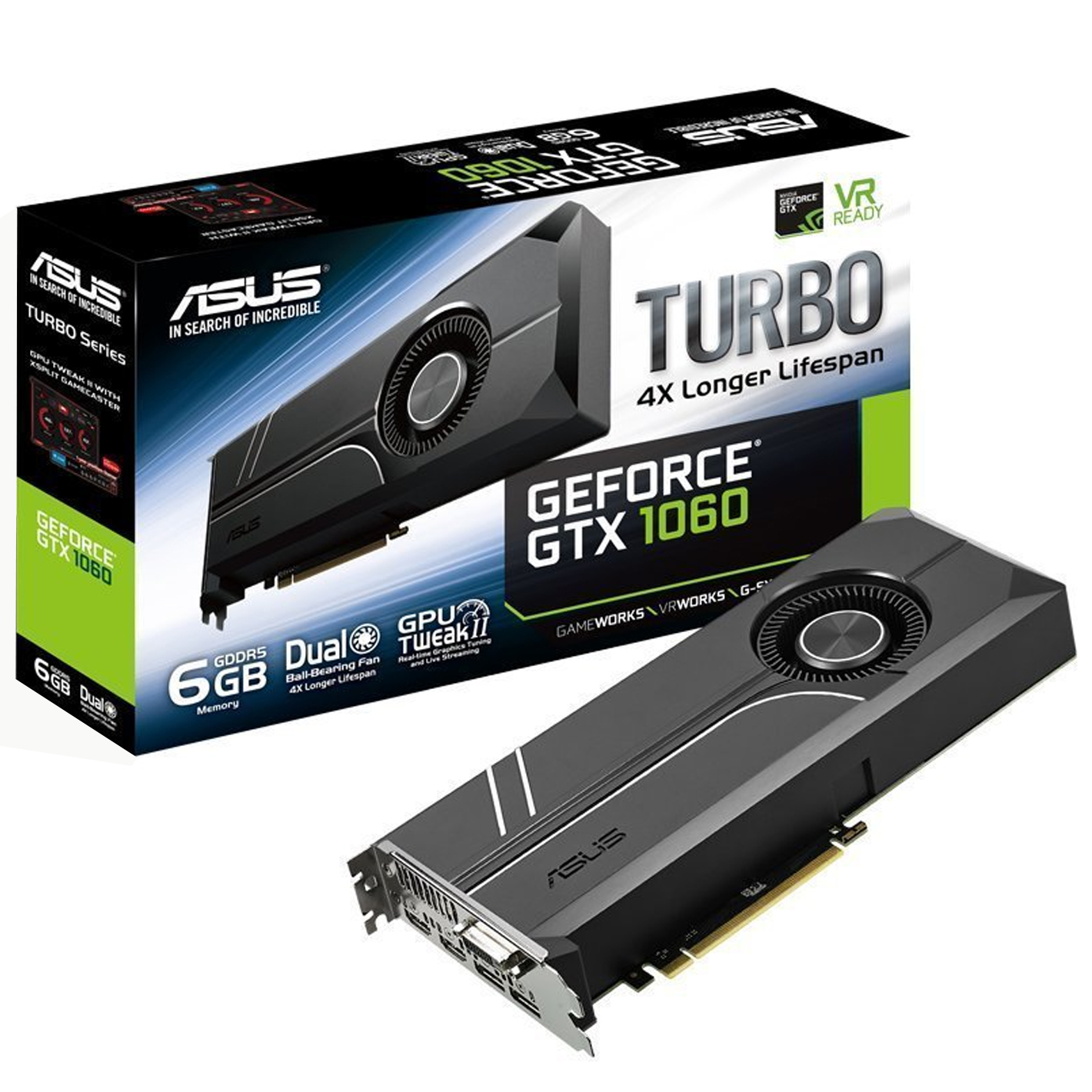 ASUS Turbo GeForce® ASUS Turbo GeForce® GTX 1060 è dotata di una ventola a doppio cuscinetto a sfera per una maggiore durata e della tecnologia Auto-Extreme Technology con componenti Super Alloy Power II per una stabilità superiore. Il logo personalizzabile retroilluminato permette una personalizzazione del sistema e le porte HDMI VR-friendly permettono ai giocatori di godere facilmente di coinvolgenti esperienze di realtà virtuale. ASUS Turbo GeForce® GPU Tweak II con Xsplit Gamecaster, fornisce un intuitivo tweaking delle prestazioni e consente lo streaming istantaneo del vostro gioco.