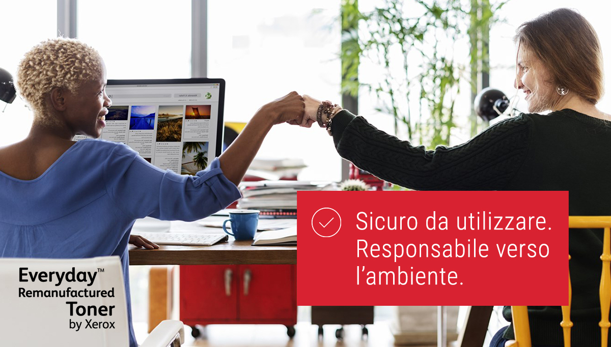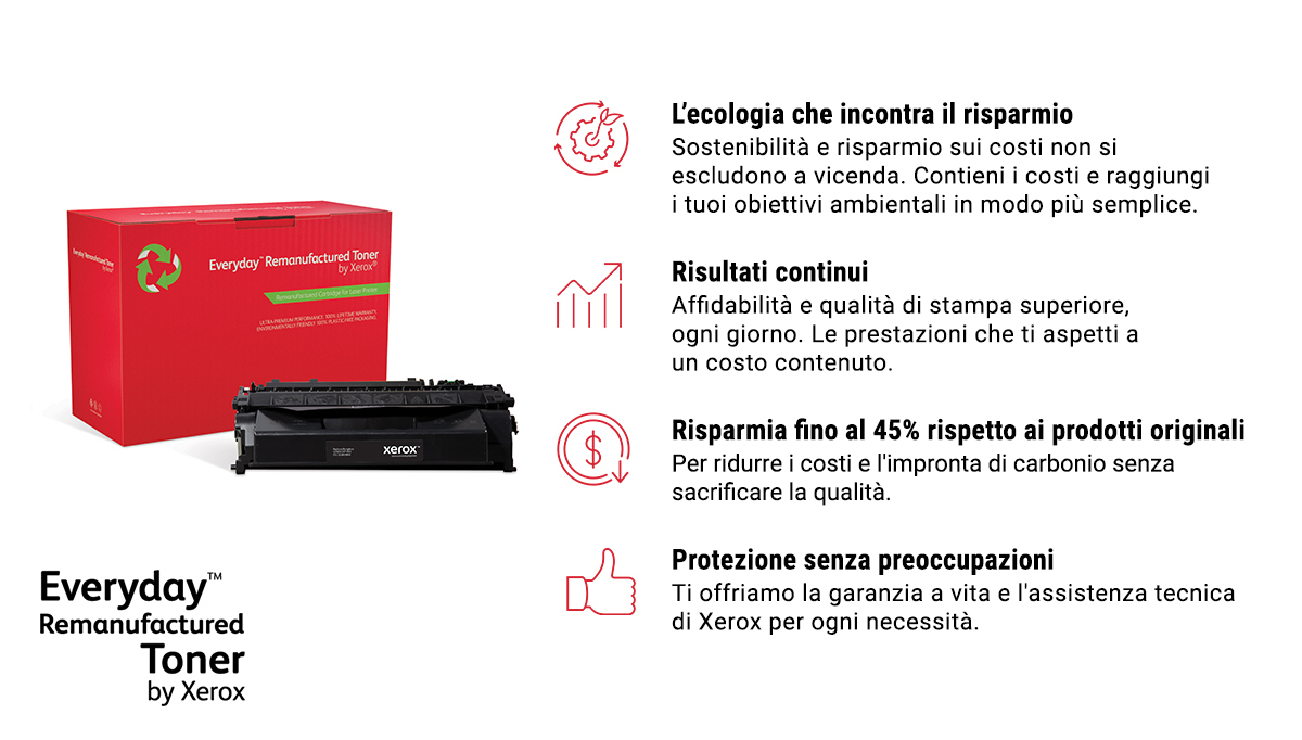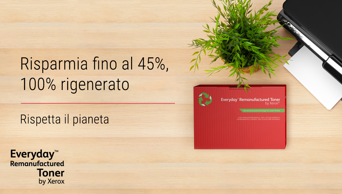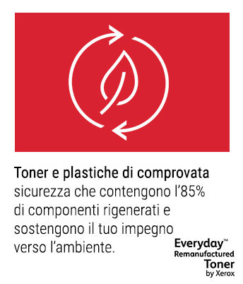 Un impegno di responsabilità ambientale rappresenta l’approccio migliore dal punto di vista commerciale, per il suo impatto positivo sul pianeta, sull’azienda e sulle persone. Il Toner rigenerato Everyday di Xerox produce un’impronta di carbonio minore rispetto a qualsiasi altra cartuccia di toner a singolo utilizzo. Perché non si dovrebbe essere obbligati a scegliere tra fare la propria parte per ridurre l’impatto sull’ambiente e il costo del toner. E la compatibilità con le marche di stampanti più diffuse ti permette di usufruire dell’impareggiabile qualità e impegno ambientale di Xerox indipendentemente dalla stampante che utilizzi.