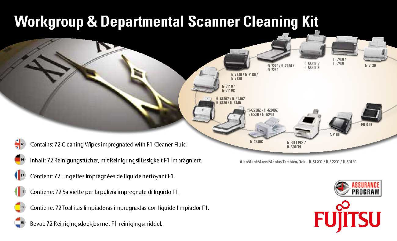 Kit di pulizia, Garantite le prestazioni ottimali del vostro scanner con questo kit di pulizia approvato dal produttore. Include: 72 salviettine imbevute di liquido per la pulizia F1. Include delle salviettine imbevute di uno speciale liquido di pulizia che rimuove efficacemente sporcizia, toner, carbone e agenti chimici della carta trattata, nonché altri residui dalle parti dello scanner che sono continuamente in contatto con la carta. Compatibile con: fi-5015C, fi-6110, fi-7140, fi-7240, fi-7160, fi-7260, fi-7180, fi-7280, fi-7460, fi-7480, fi-5530C2, fi-6010N, ScanSnap N1800, fi-6130LA, fi-6230LA, fi-6130ZLA, fi-6230ZLA, fi-6130Z, fi-6230Z, fi-6140Z, fi-6240Z, fi-4120C, fi-4120C2, fi-4220C, fi-4220C2, fi-4340C, fi-5110C, fi-5120C, fi-5220C, fi-5530C, fi-6000NS, fi-6130, fi-6140, fi-6230, fi-6240, SP-1120, SP-1125, SP-1130, fi-7030.