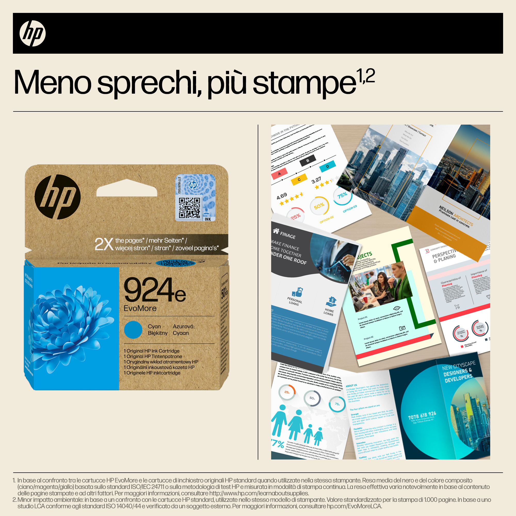 Le Cartucce di Inchiostro Originali HP EvoMore sono progettate per mettere la sostenibilità al primo posto e offriti le prestazioni e la qualità degli altri prodotti HP. Consentono infatti di stampare il doppio delle pagine[3] con meno emissioni di anidride carbonica[2] rispetto alle cartucce standard HP e sono estremamente facili da riciclare.[4]