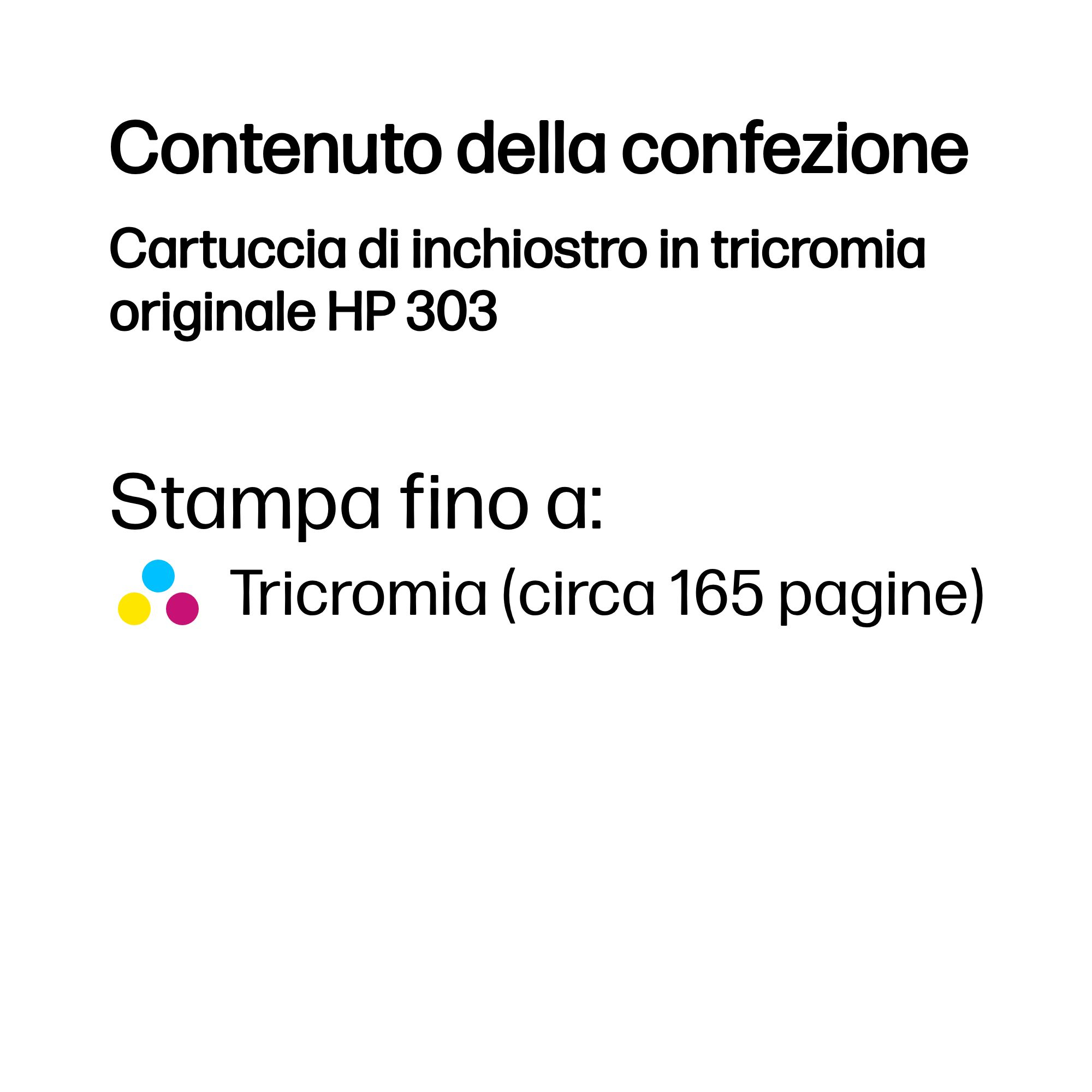 | Compatibilità | Le cartucce di inchiostro originali HP 303 funzionano con i seguenti dispositivi: HP Envy 6200, 7134, 7220e, 7221e, 7224e, 7800, 7900e, HP Envy Photo 7230, HP Envy Photo 7231, HP Envy Photo 7234, HP Envy Photo 7930, HP Envy Photo 7931, HP Envy Photo 7934 HP Tango X |