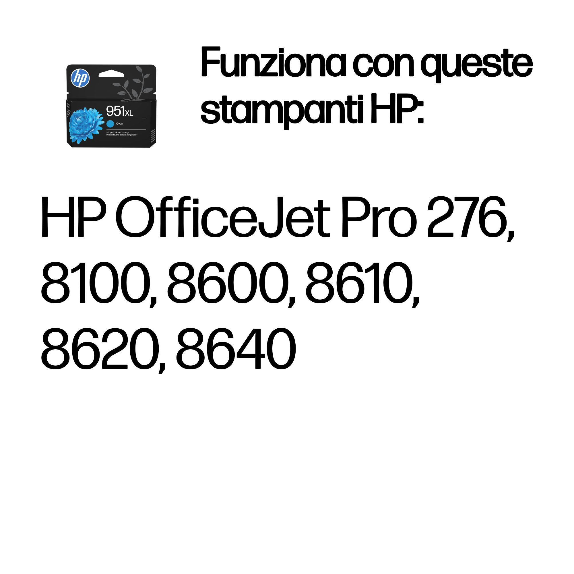 | Compatibilità | Le cartucce di inchiostro originali HP 951 funzionano con i seguenti dispositivi: HP OfficeJet Pro 276, 8100, 8600, 8610, 8620, 8640 |
