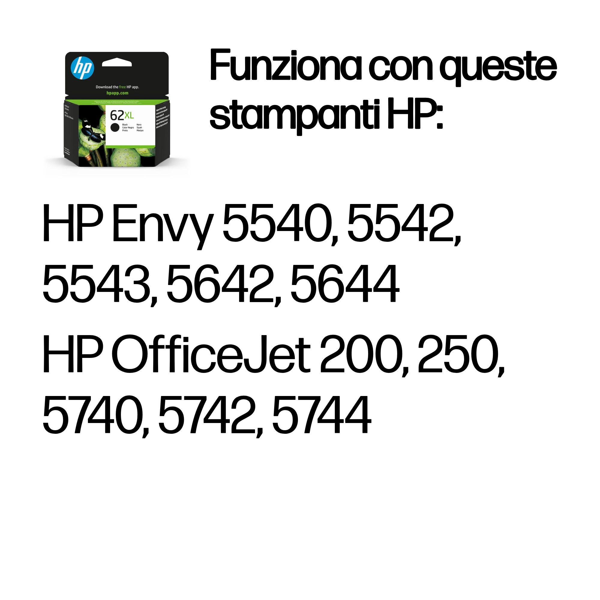 | Compatibilità | Le cartucce di inchiostro originali HP 62 funzionano con i seguenti dispositivi: HP Envy 5540, 5542, 5543, 5642, 5644 HP OfficeJet 200, 250, 5740, 5742, 5744 |