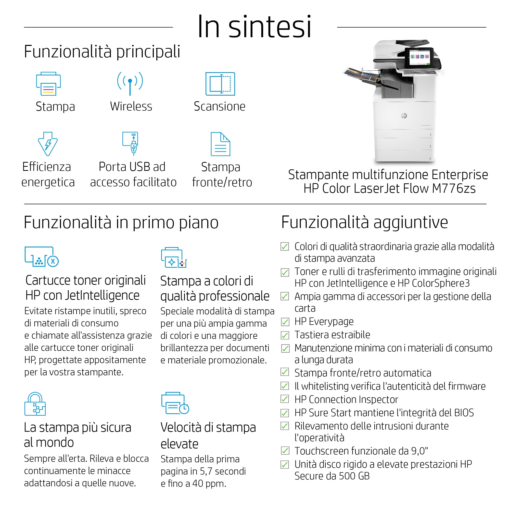 | Contenuto scatola | HP Color LaserJet Enterprise Flow MFP M776zs printer; HP Black Original LaserJet Toner Cartridge (~16,000 pages), HP Cyan, Magenta and Yellow Original LaserJet Toner Cartridges (~13,000 pages each), and 4 HP Original LaserJet Imaging Drums (~65,000 pages each color); Getting started Guide; 1 Power cord |