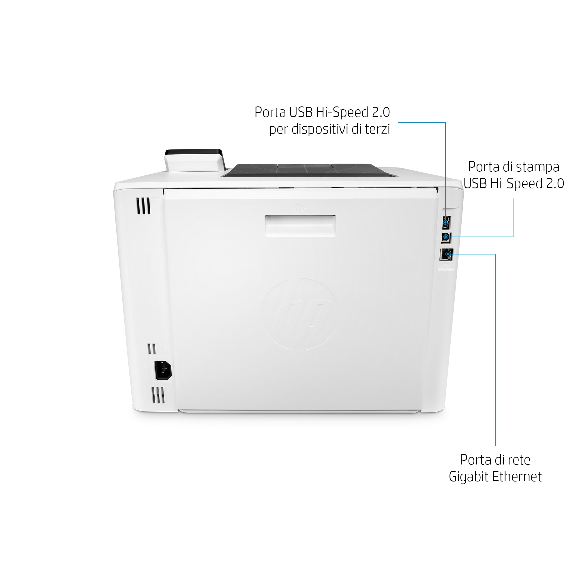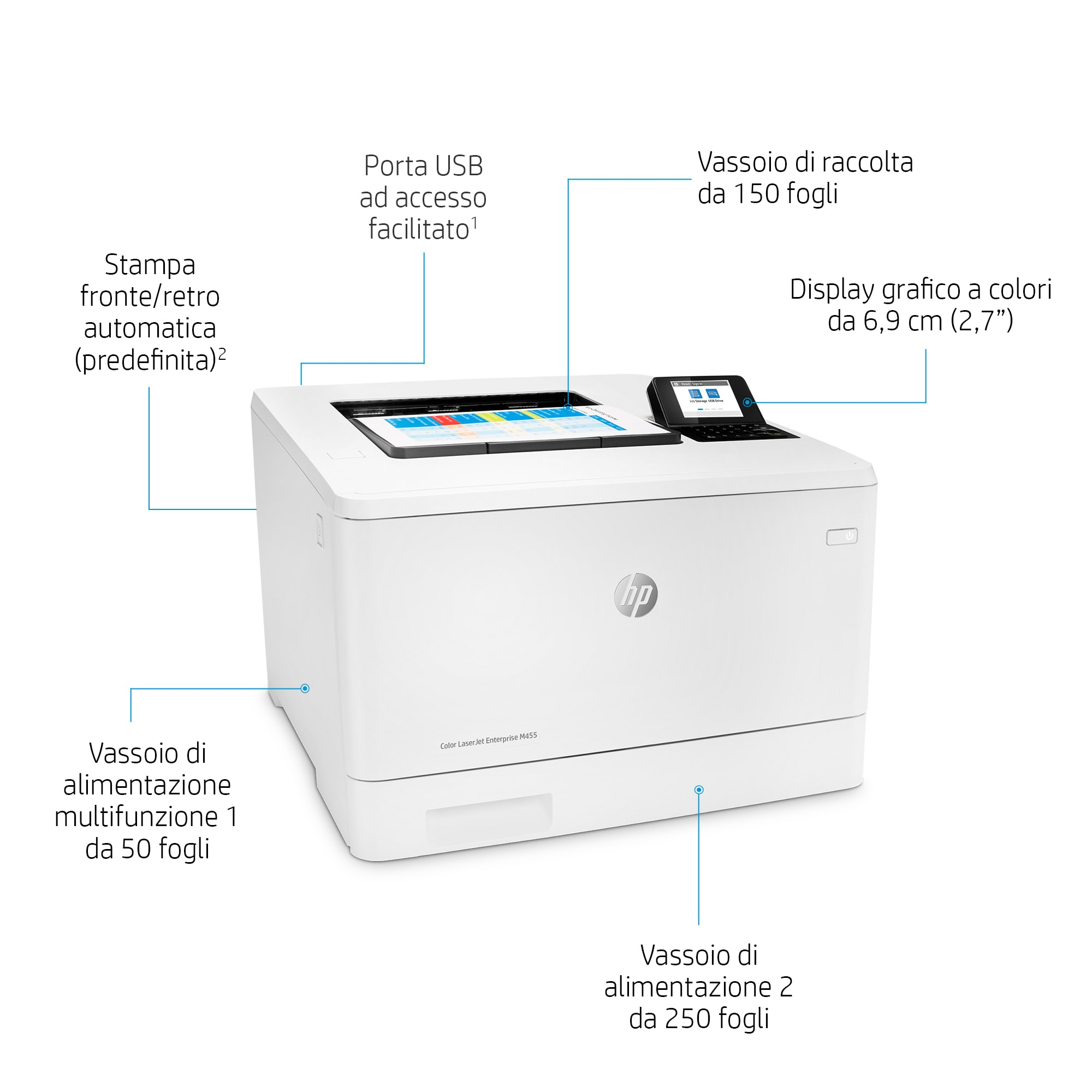 | Contenuto scatola | HP Color LaserJet Enterprise M455dn printer; HP Black Original LaserJet Toner Cartridge (~2,400 pages); HP Cyan, Magenta, Yellow Original LaserJet Toner Cartridges (~2,100 pages each); Getting started Guide; 1 Power cord |