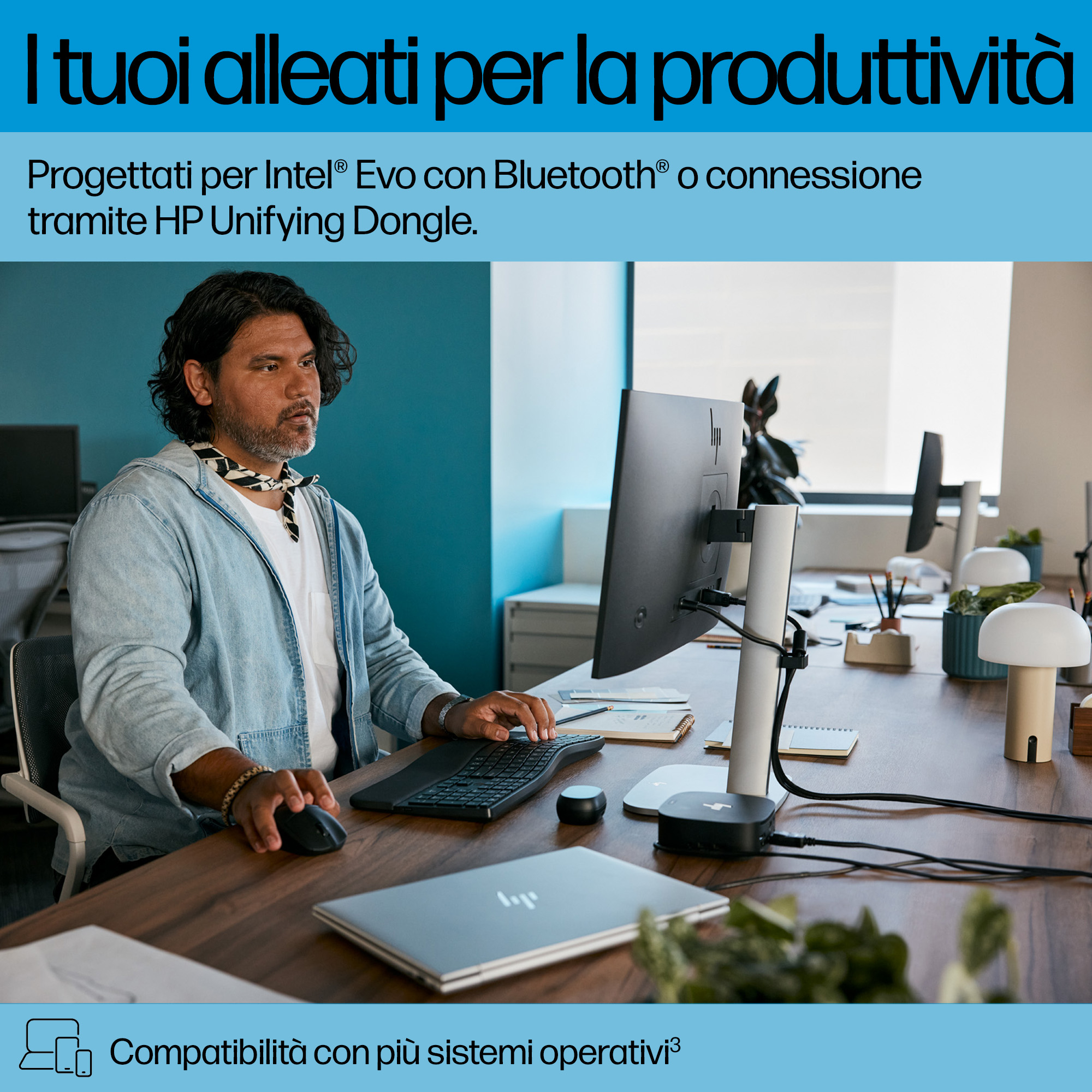 Lavorate senza pensieri: questa combinazione di tastiera e mouse dual-mode è progettata per un facile collegamento ai dispositivi aziendali. La tecnologia Bluetooth® e il dongle HP Unifying offrono connessioni sicure ed efficienti. Progettata per dispositivi Intel® Evo™ e compatibile con più sistemi operativi<sup>[2]</sup> per un flusso di lavoro più fluido e sicuro.