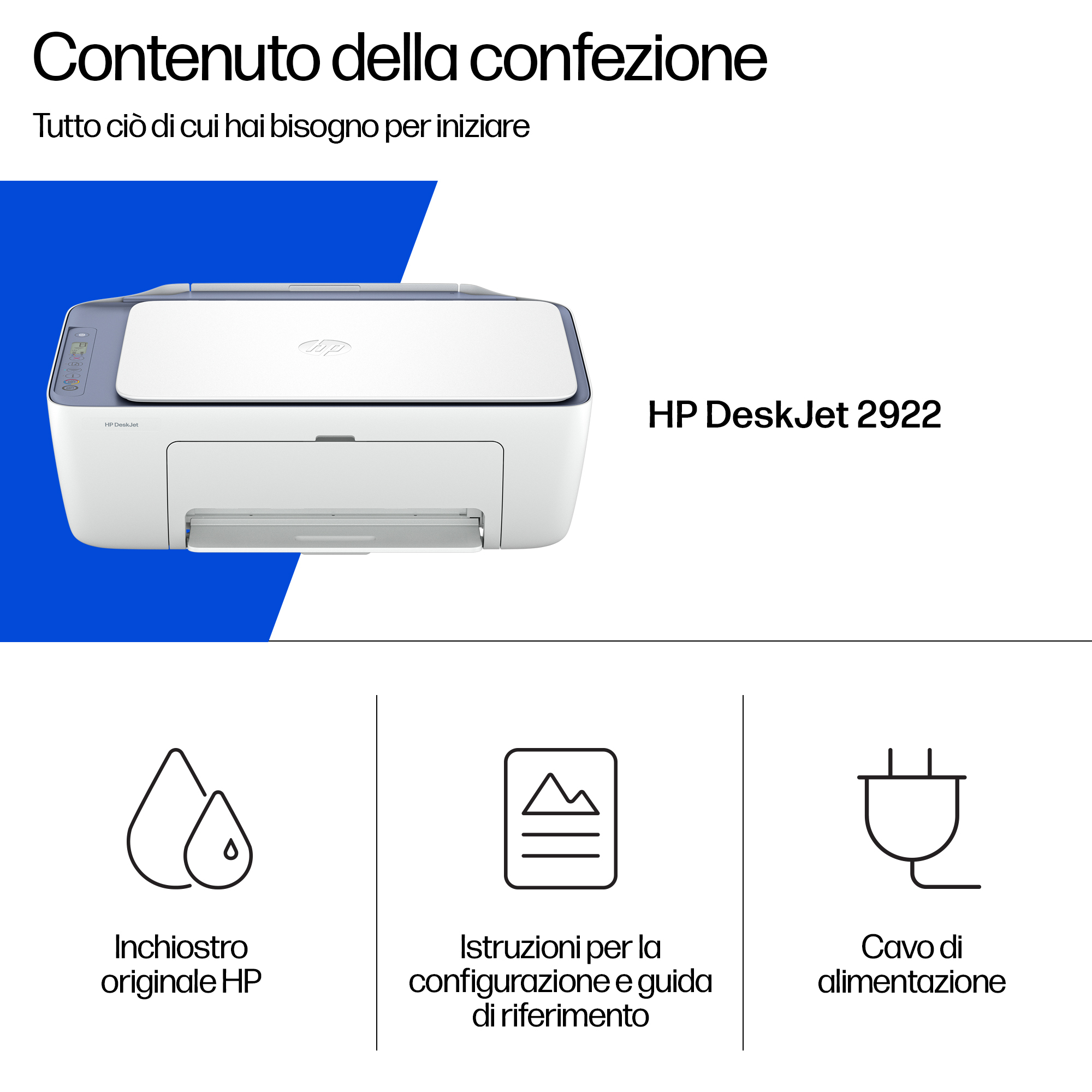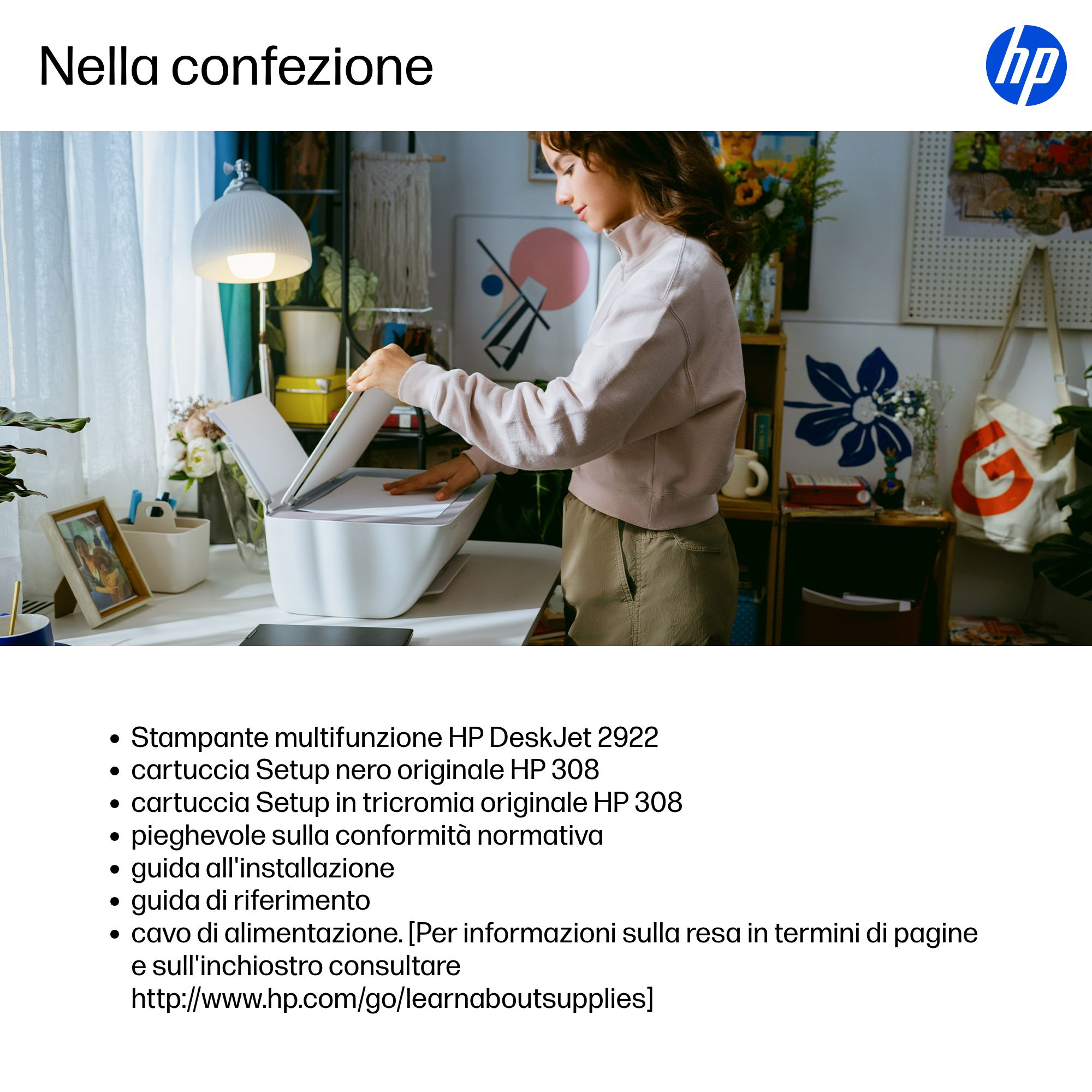 | Contenuto scatola | Stampante multifunzione HP DeskJet 2922; cartuccia Setup nero originale HP 308; cartuccia Setup in tricromia originale HP 308; pieghevole sulla conformità normativa; guida all'installazione; guida di riferimento; cavo di alimentazione. [Per informazioni sulla resa in termini di pagine e sull'inchiostro consultare http://www.hp.com/go/learnaboutsupplies] |