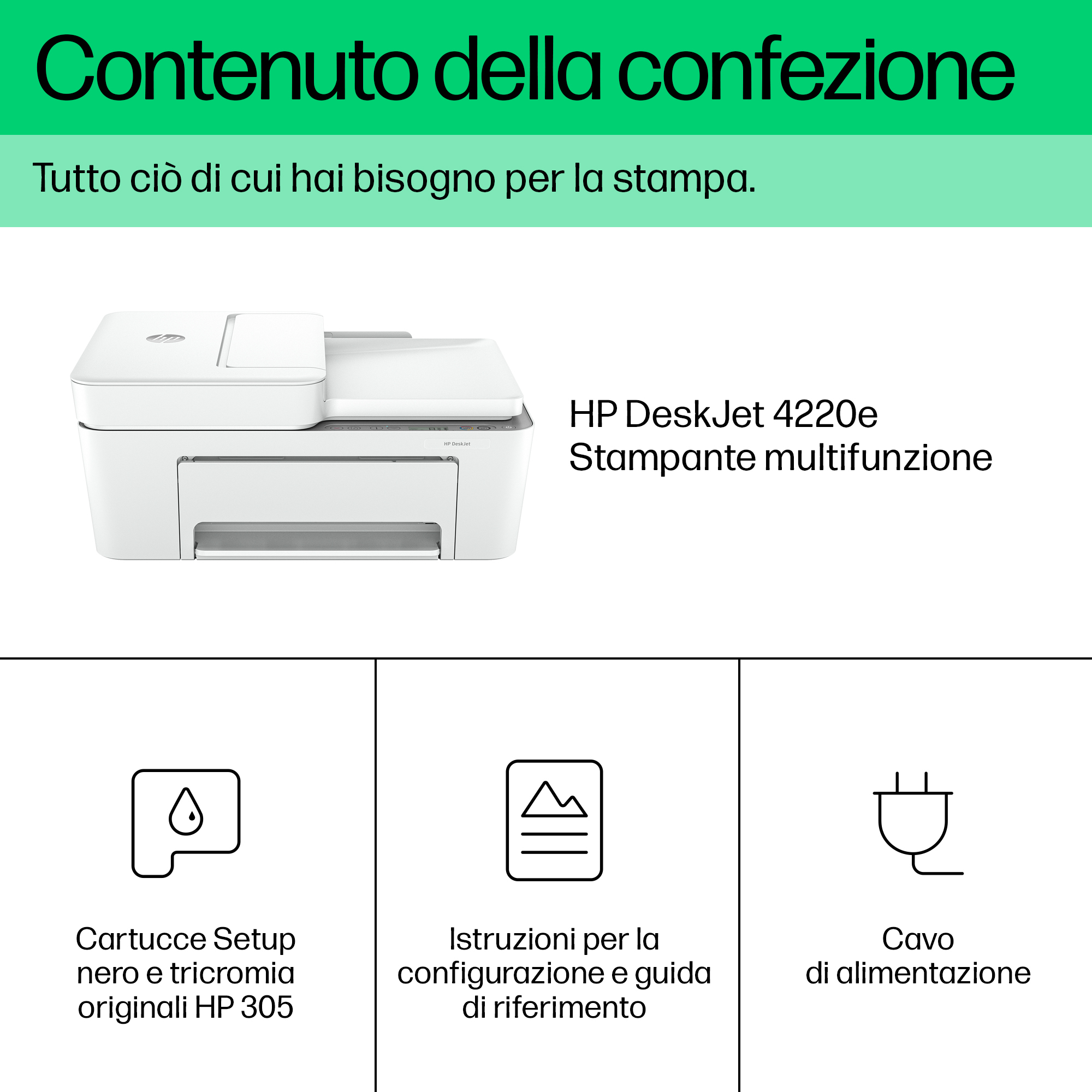 | Contenuto scatola | HP DeskJet 4220e All-in-One Printer; HP 305 Setup Black Cartridge (~120 pages yield); HP 305 Setup Tri-Color Cartridge (~100 pages yield); Regulatory flyer; Setup guide; Reference guide; Power cord [For ink volume and page yield information, visit http://hp.com/go/learnaboutsupplies] |