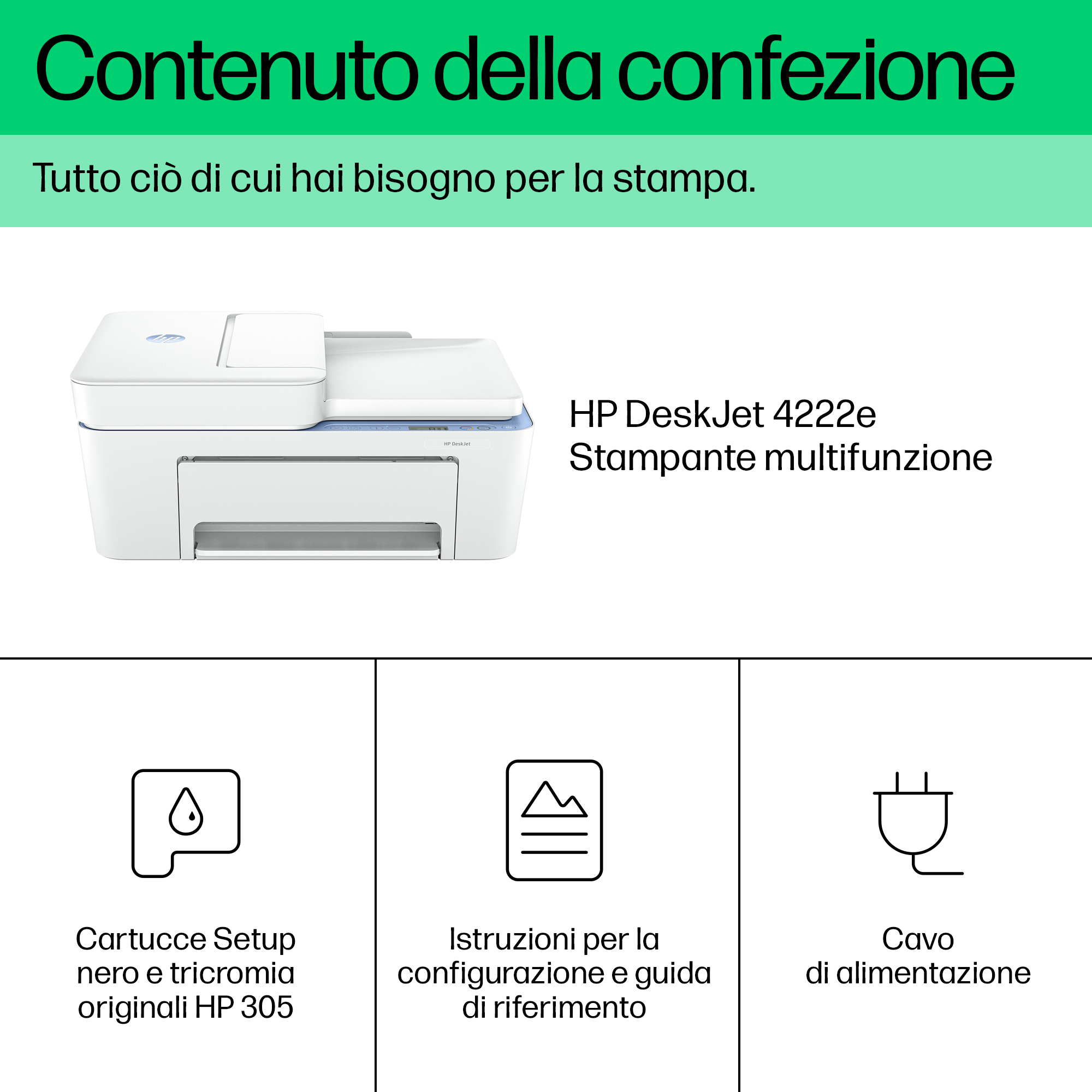 | Contenuto scatola | HP DeskJet 4222e All-in-One Printer; HP 305 Setup Black Cartridge (~120 pages yield); HP 305 Setup Tri-Color Cartridge (~100 pages yield); Regulatory flyer; Setup guide; Reference guide; Power cord [For ink volume and page yield information, visit http://hp.com/go/learnaboutsupplies] |