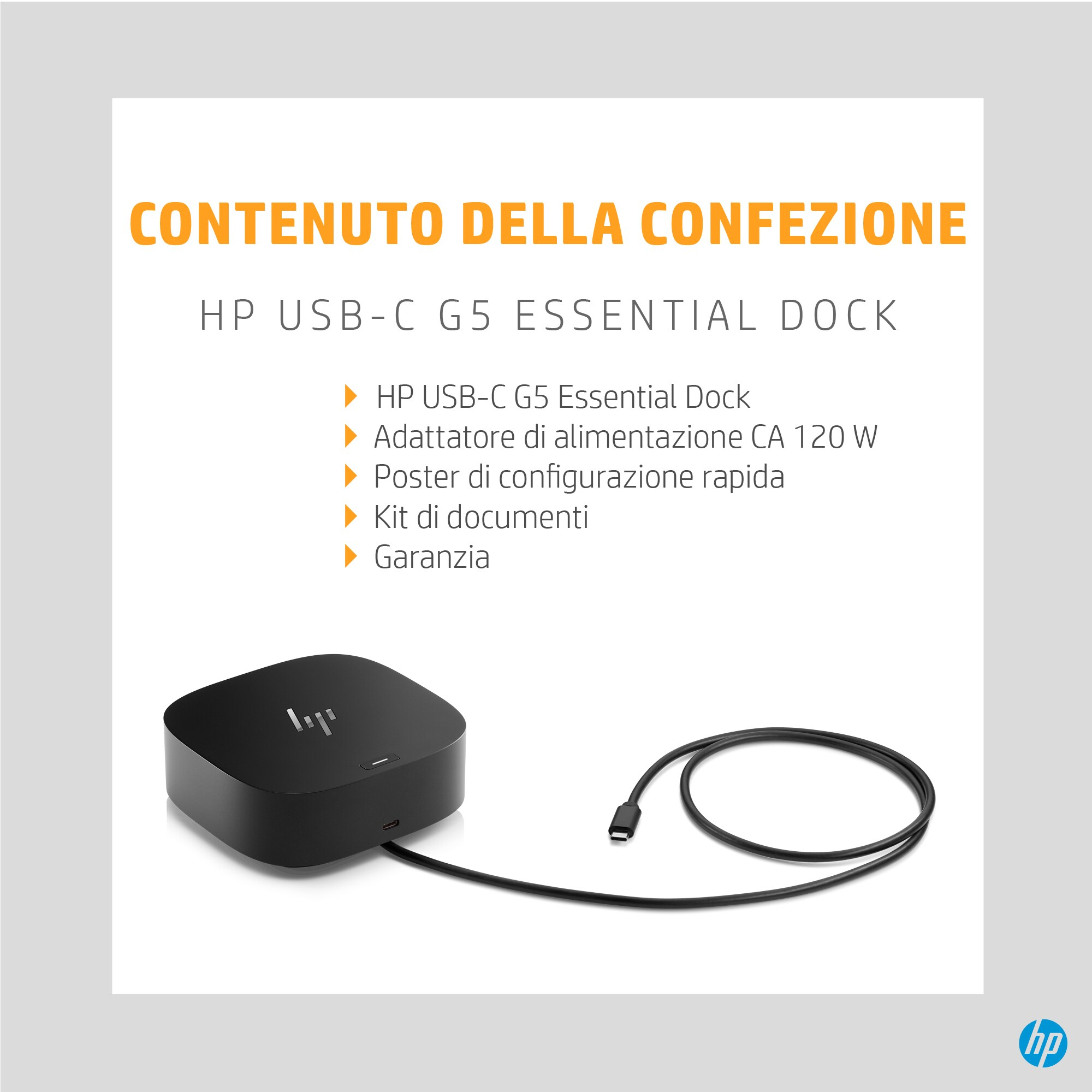 Questa dock dal formato compatto offre tutto il necessario per svolgere qualunque lavoro, mantenendo perfettamente in ordine la scrivania. Basta un singolo cavo USB-C®[1] per collegare tutti gli accessori e un massimo di tre display ad alta risoluzione,[2] ottenere una connessione Ethernet stabile e molto altro ancora. Il tutto mentre ricaricate il vostro laptop[1]. HP USB-C G5 Essential Dock è la soluzione ideale per riorganizzare la scrivania e riordinare le idee.
