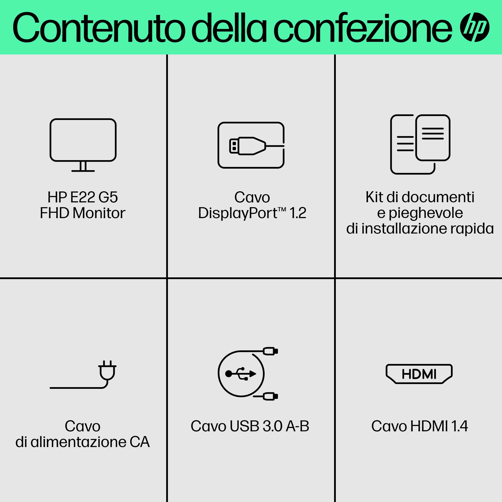 Realizzato appositamente per offrire immagini nitide, opzioni personalizzate per la massima comodità e autentica flessibilità, il monitor HP E22 G5 FHD ridefinisce il concetto di comfort, in modo che possiate lavorare al meglio senza ostacoli. Un display dallo stile elegante, progettato pensando all'ambiente, perfetto sia in ufficio che in casa.