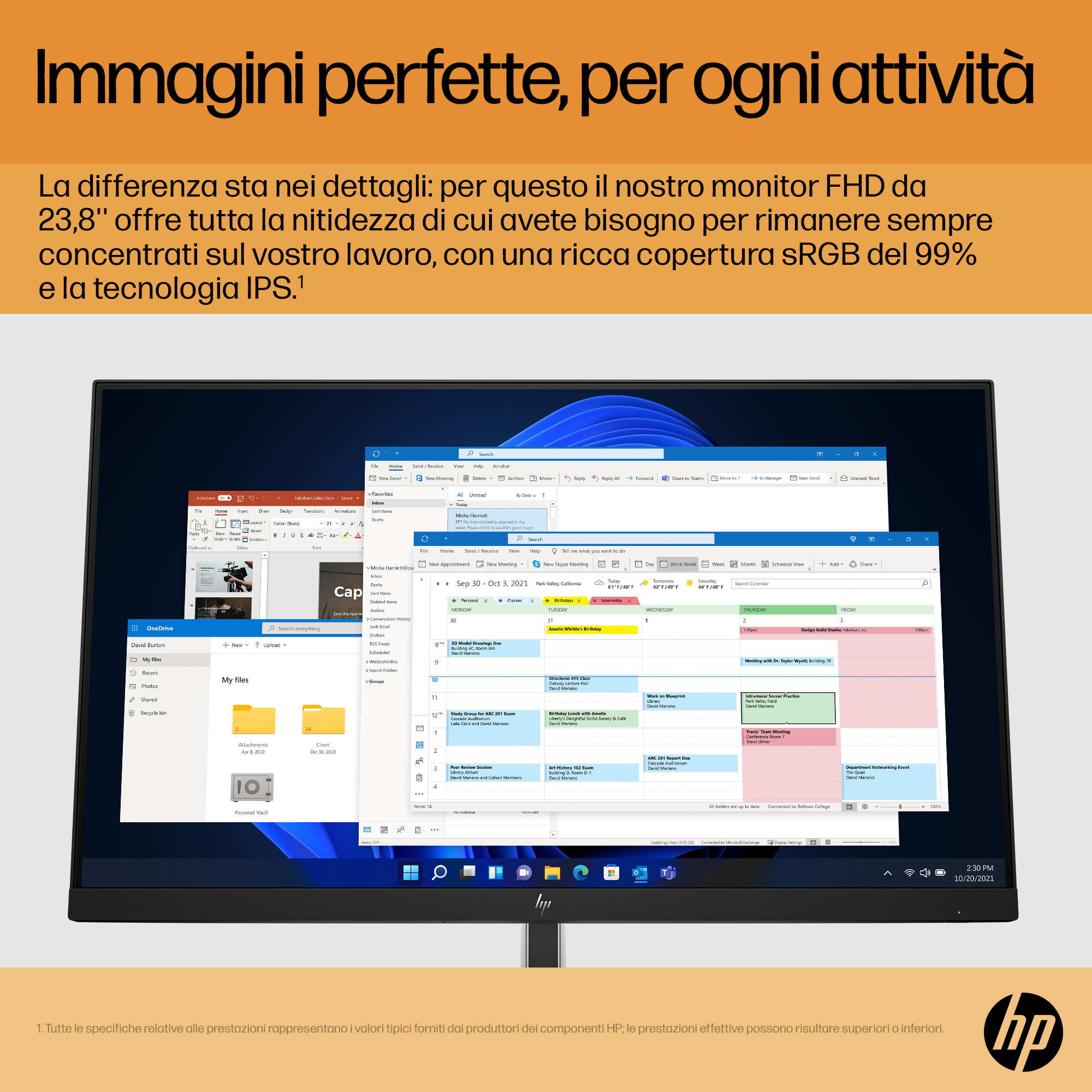 Quando i dettagli fanno la differenza, questo monitor FHD con diagonale da 23,8" offre la nitidezza di cui avete bisogno per rimanere concentrati sul vostro lavoro. Con una profondità del colore sRGB del 99% e tecnologia IPS[1], i colori saranno nitidi e brillanti su ampi angoli di visione[2].