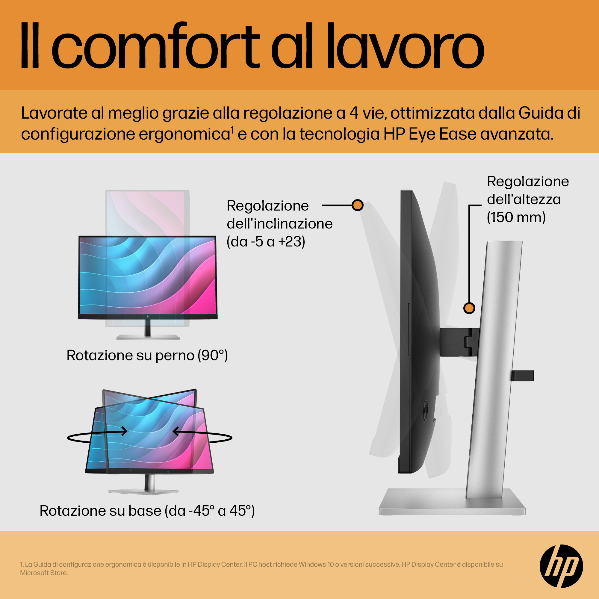 Se per dare il meglio è necessario sentirsi al meglio, la regolazione a 4 vie ottimizzata tramite la Guida dettagliata all'installazione ergonomica, disponibile in HP Display Center, garantisce un alto livello di comfort per tutta la giornata[3]. Massimo comfort di visione con un monitor dotato di tecnologia flicker-free, frequenza di refresh di 75 Hz[1] e HP Eye Ease, il filtro luce blu integrato e sempre attivo.