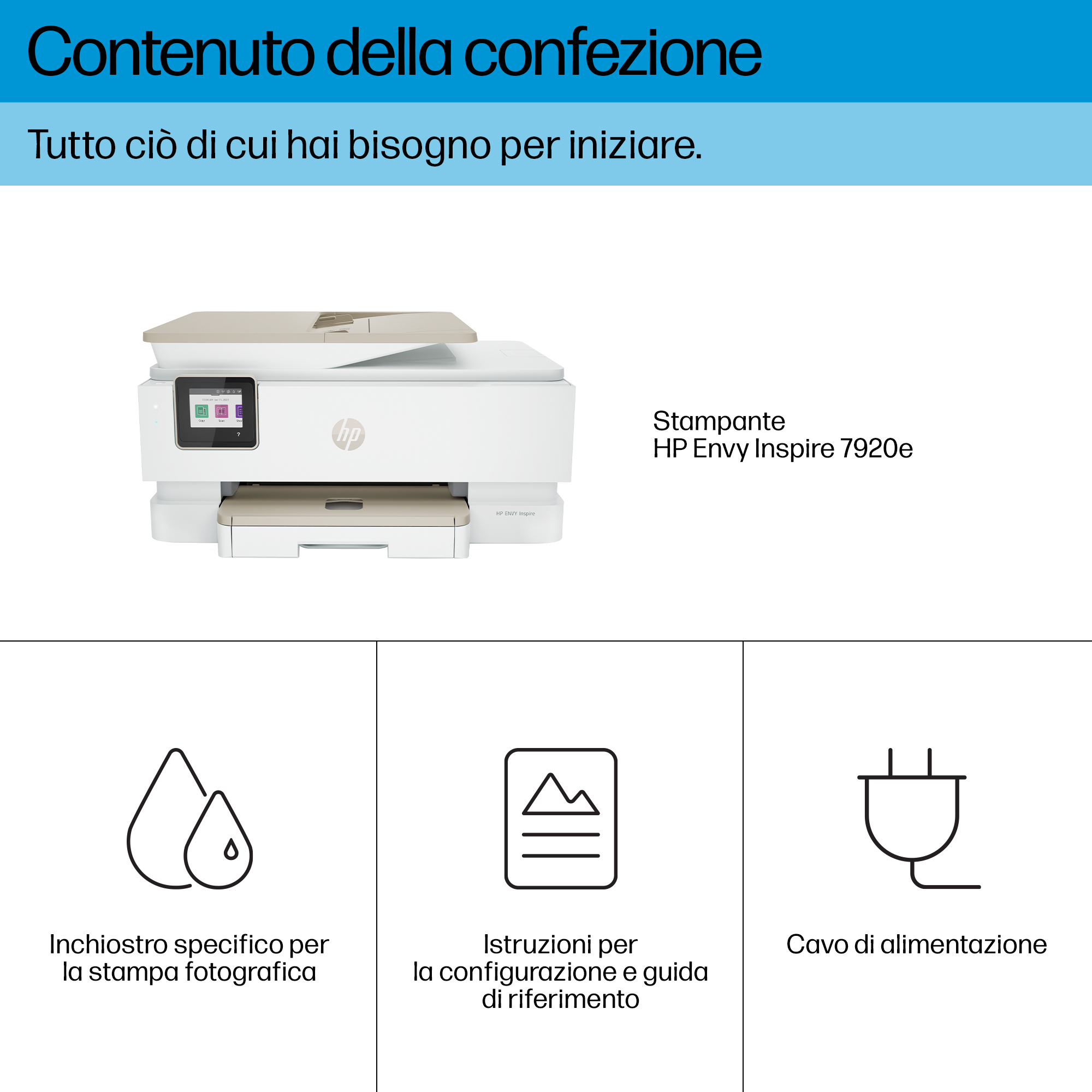 | Contenuto scatola | Stampante multifunzione HP ENVY Inspire 7920e; Cartuccia Setup originale HP 303 nero, idonea per HP Instant Ink; Cartuccia Setup Originale HP 303 tricromia, idonea per HP Instant Ink; pieghevole contenente avvertenze sull'utilizzo dell'inchiostro; pieghevole sulla conformità normativa; guida all'installazione; guida di riferimento; Fogli di carta HP Advanced lucida e carta fotografica opaca HP inclusi nella confezione; cavo di alimentazione. [Per informazioni sulla resa in termini di pagine e sull'inchiostro consultare http://www.hp.com/go/learnaboutsupplies] |