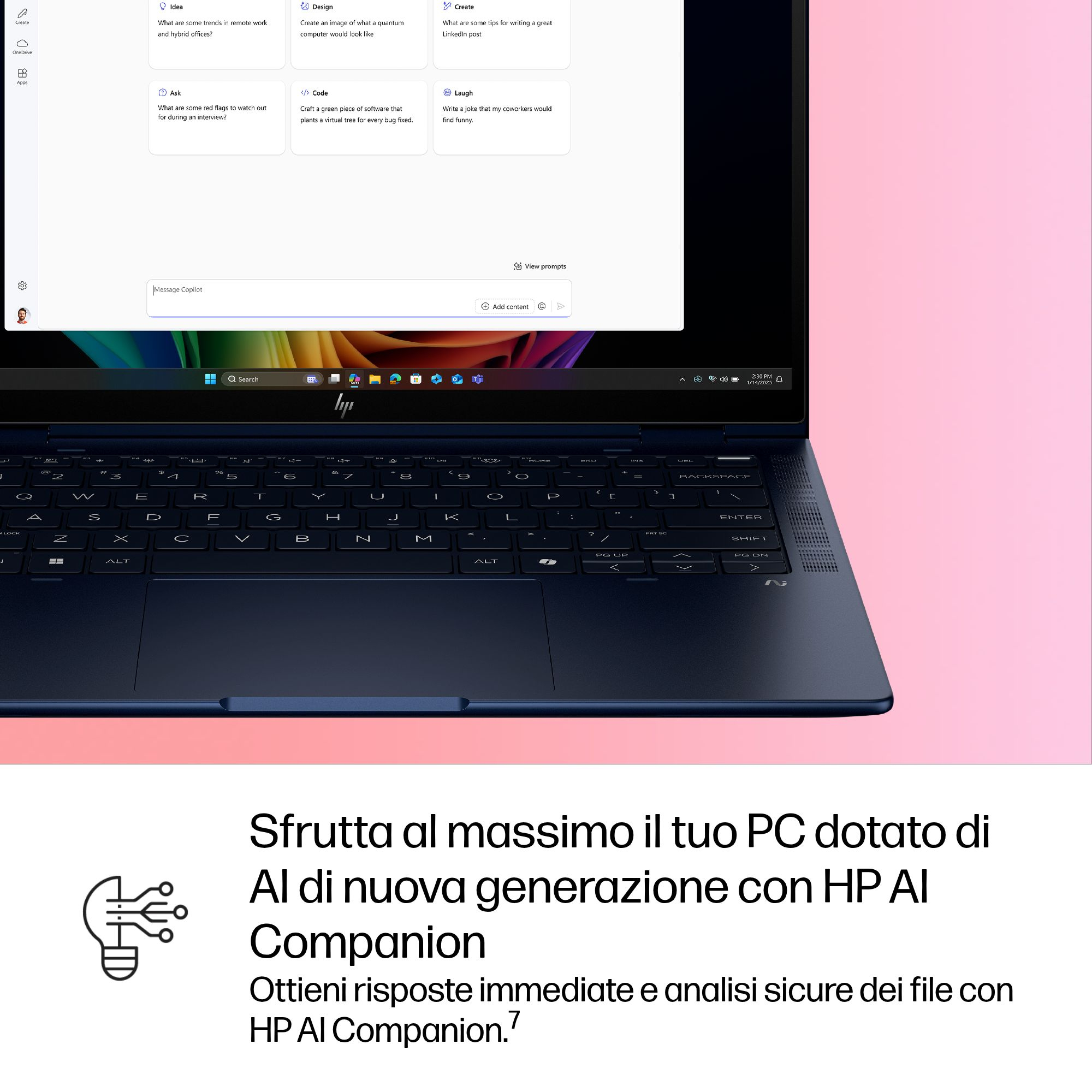 Lavorate ovunque senza rinunciare alle prestazioni con Windows 11 e la tecnologia di collaborazione, sicurezza e connettività di HP. Riassumete e riscrivete i testi, ottenete suggerimenti e organizzate il vostro lavoro con Microsoft Copilot.[6]