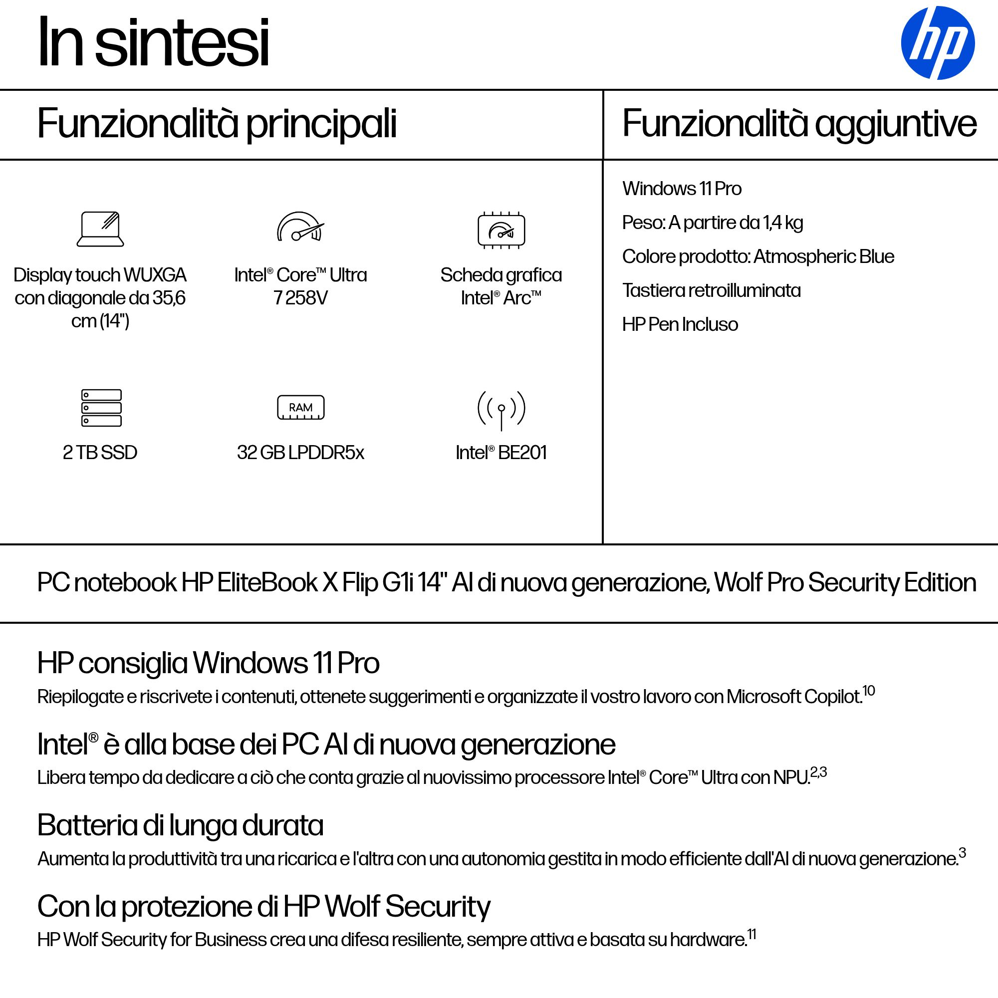HP EliteBook X Flip G1i Notebook Next Gen AI - Design ruotabile - Intel Core Ultra 7 - 258V / fino a 4.8 GHz - Win 11 Pro - Intel Arc Graphics 140V - 32 GB RAM - 2 TB SSD NVMe, TLC - 14" IPS touchscreen 1920 x 1200 - Wi-Fi 7, Bluetooth - blu atmosfer