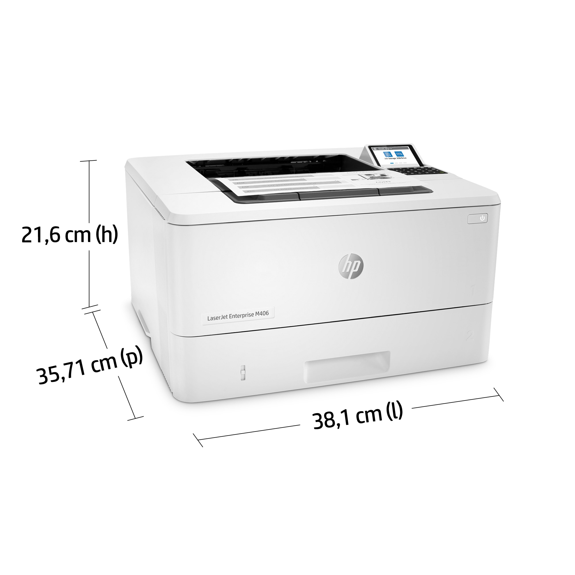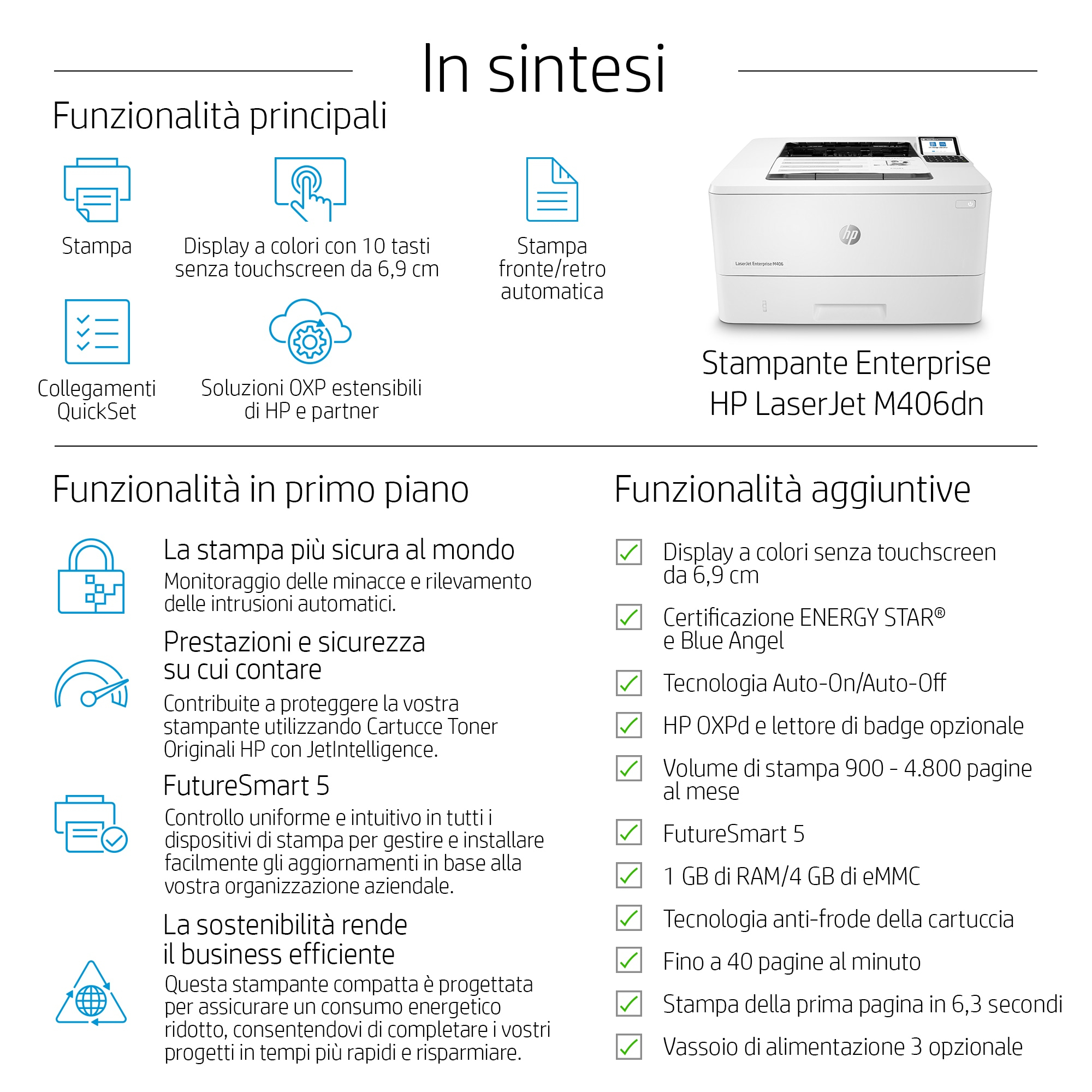 | Contenuto scatola | HP LaserJet Enterprise M406dn printer; HP Black Original LaserJet Toner Cartridge (~3,000 pages); Getting started Guide; 1 Power cord |