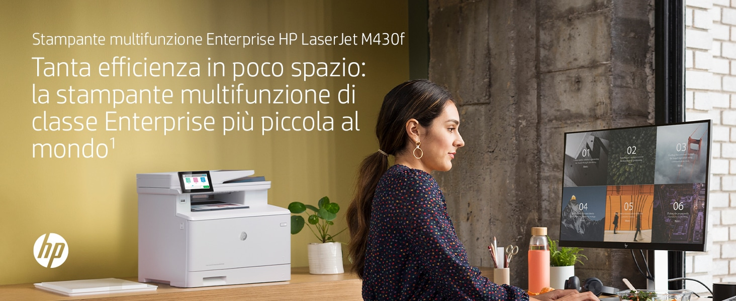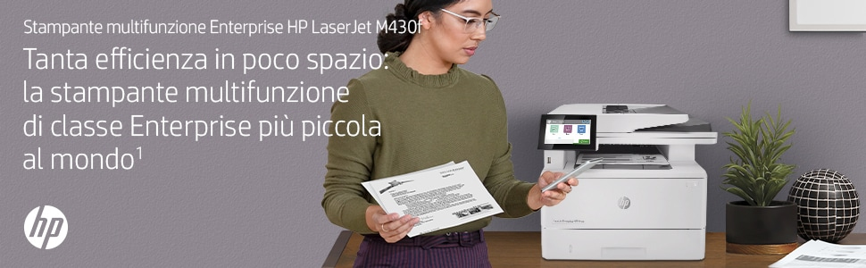 | Contenuto scatola | HP LaserJet Enterprise MFP M430f printer; HP Black Original LaserJet Toner Cartridge (~3,000 pages); Getting started Guide; 1 Power cord |