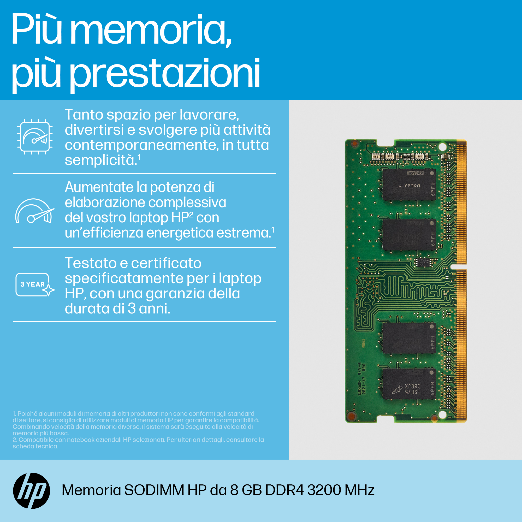 L'upgrade del modulo SODIMM, oltre ad ampliare la RAM a disposizione, aumenta la potenza di elaborazione complessiva del vostro laptop HP, aprendo le porte alla velocità e alla produttività[1]. La memoria DDR4 è estremamente efficiente e garantisce che la batteria non si scarichi velocemente e che non si verifichino surriscaldamenti.