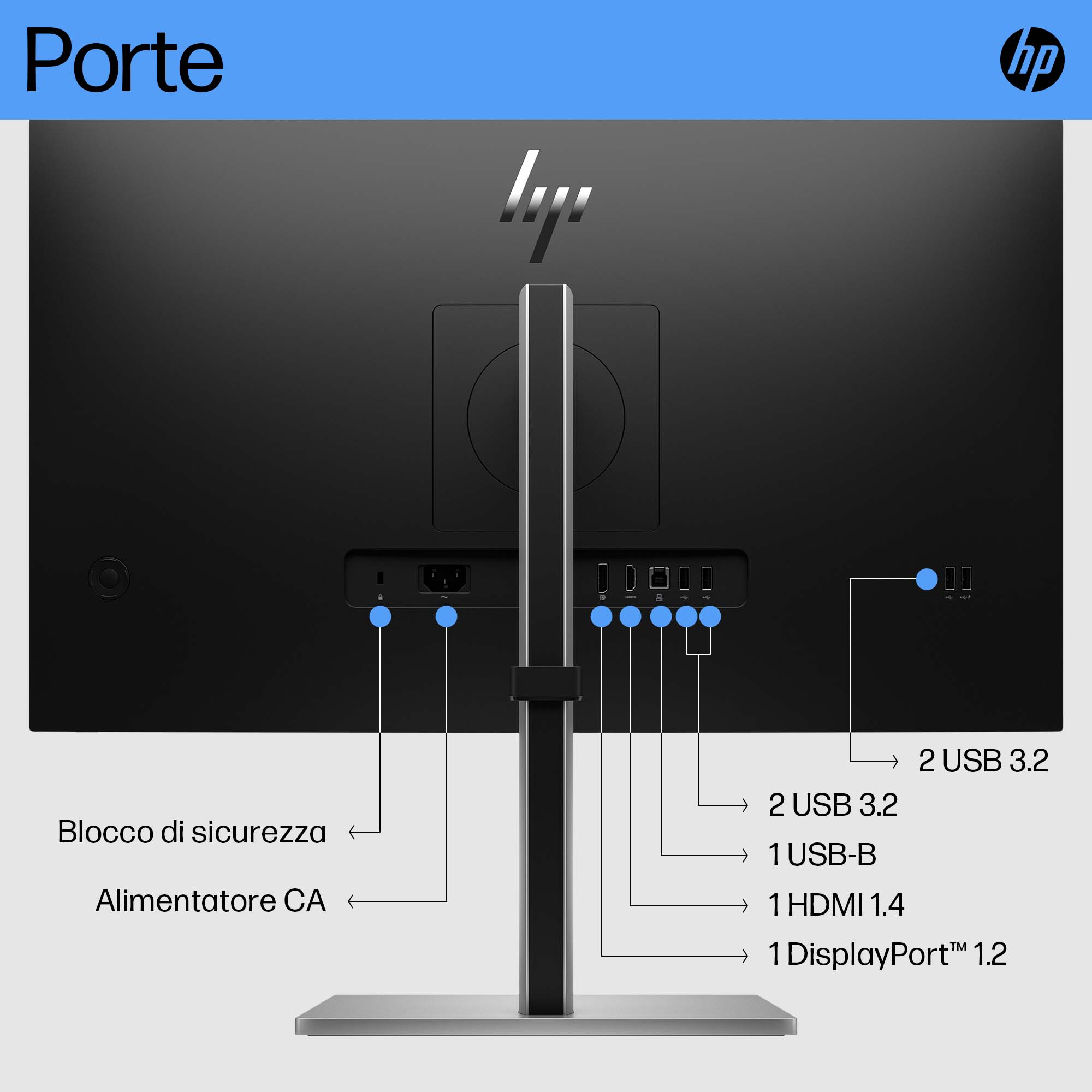Più porte per maggiori funzionalità. Con ingressi HDMI, DisplayPort™, USB-B e 4 porte USB-A 3.2, potete collegare più dispositivi, ad esempio cuffie e webcam.[7]