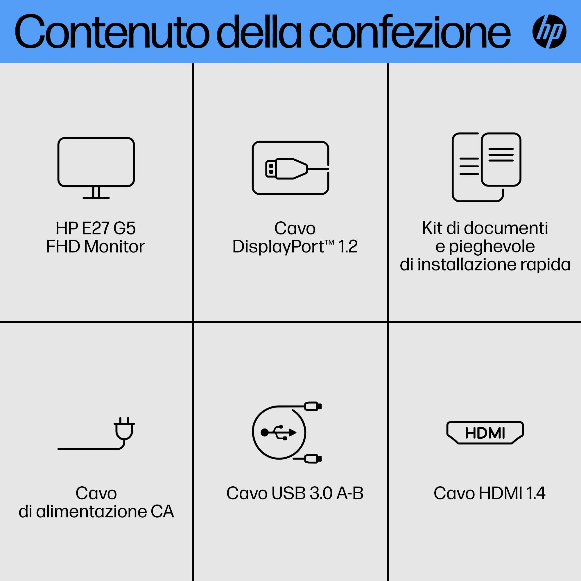 Realizzato appositamente per offrire immagini nitide, opzioni personalizzate per la massima comodità e autentica flessibilità, il monitor HP E27 G5 FHD ridefinisce il concetto di comfort, in modo che possiate lavorare al meglio senza ostacoli. Un display dallo stile elegante, progettato pensando all'ambiente, perfetto sia in ufficio che in casa.