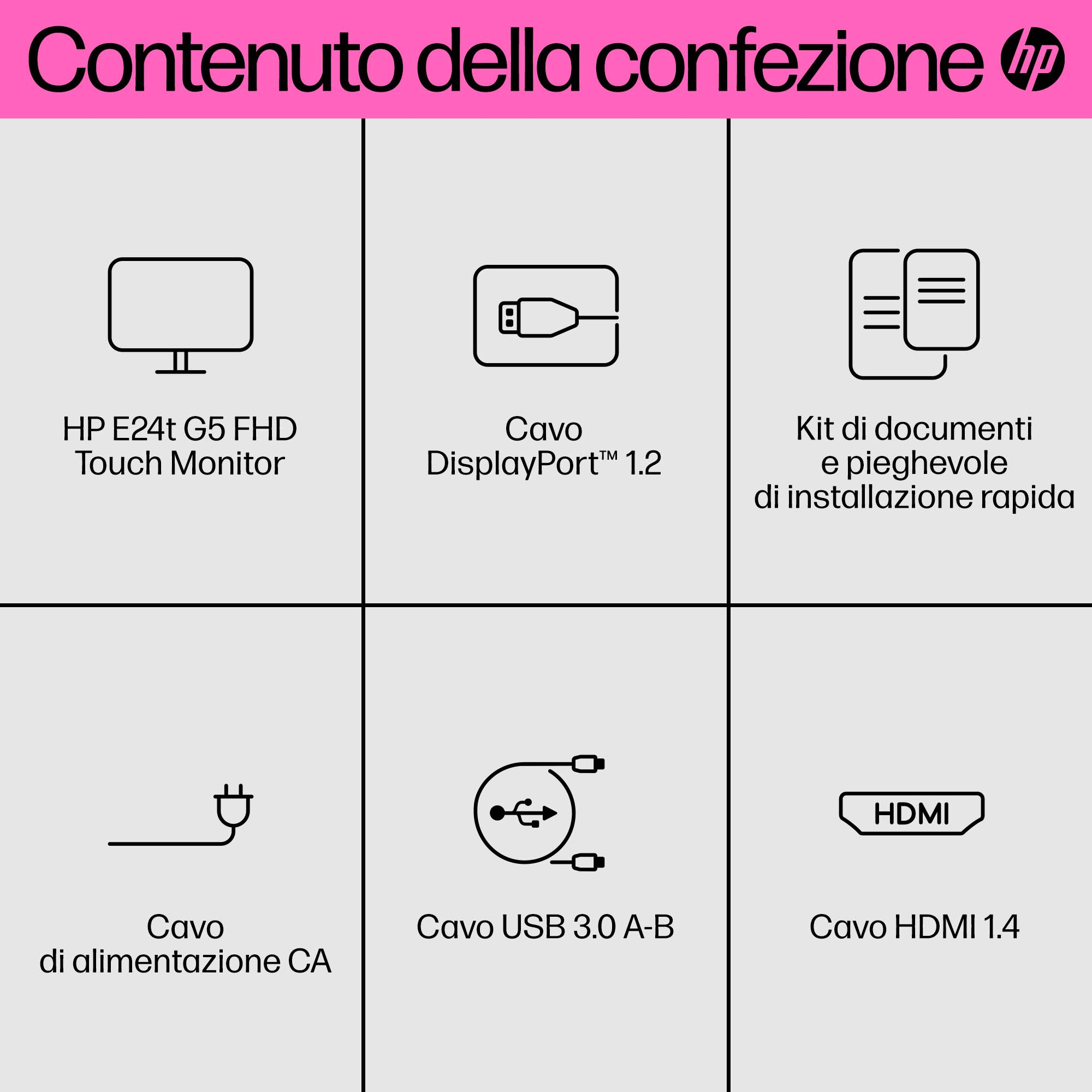 | Contenuto scatola | Monitor; cavo DisplayPort™; cavo HDMI; scheda di garanzia; cavo da USB Type-B ad A; pieghevole di installazione rapida; cavo di alimentazione CA |