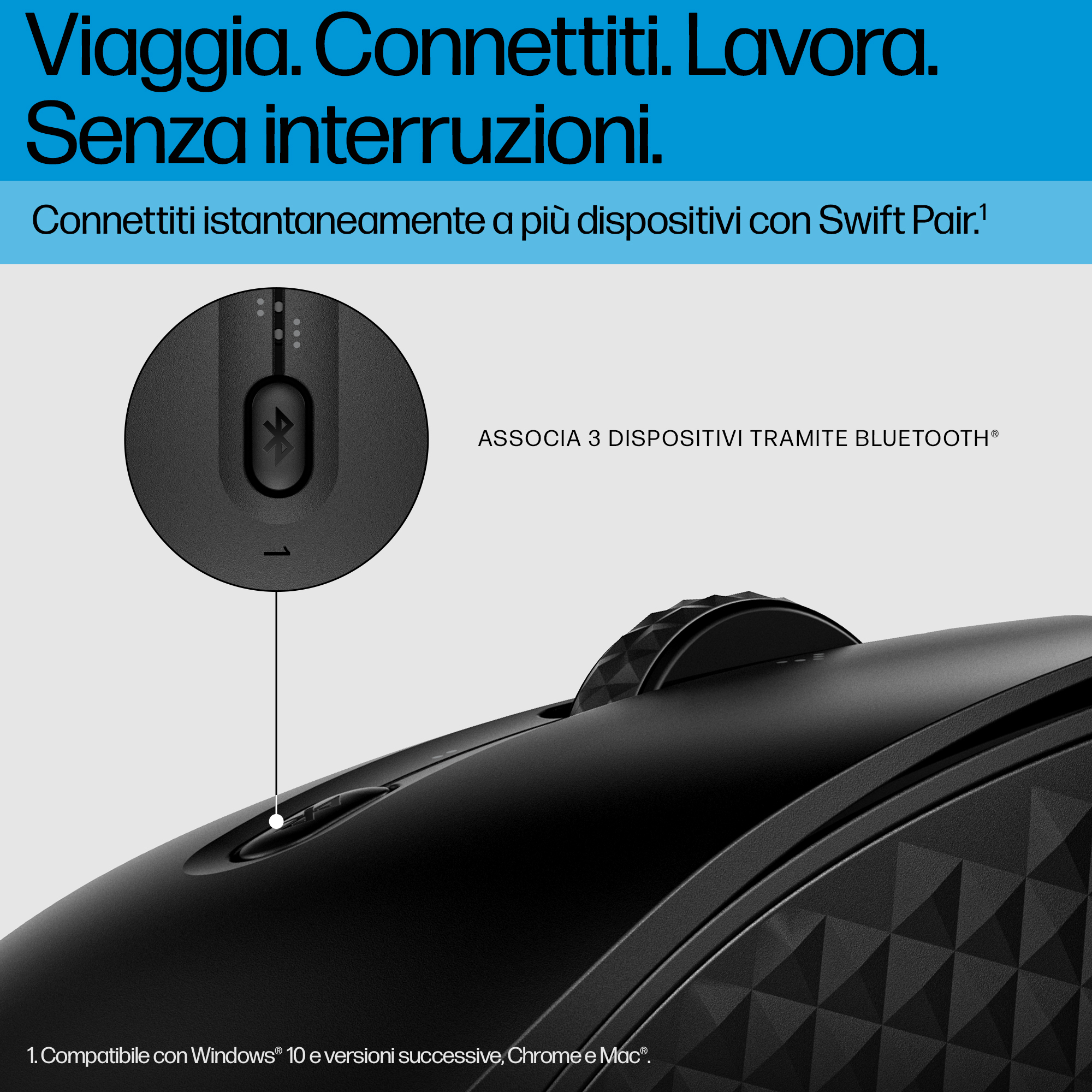 Indipendentemente dal dispositivo o dal sistema operativo in uso<sup>[3]</sup>, potete connettere fino a tre dispositivi a un singolo mouse. La connessione istantanea senza dongle, basata su Bluetooth 5.3 Low Energy e Microsoft Swift Pair, permette di lavorare senza problemi ovunque.