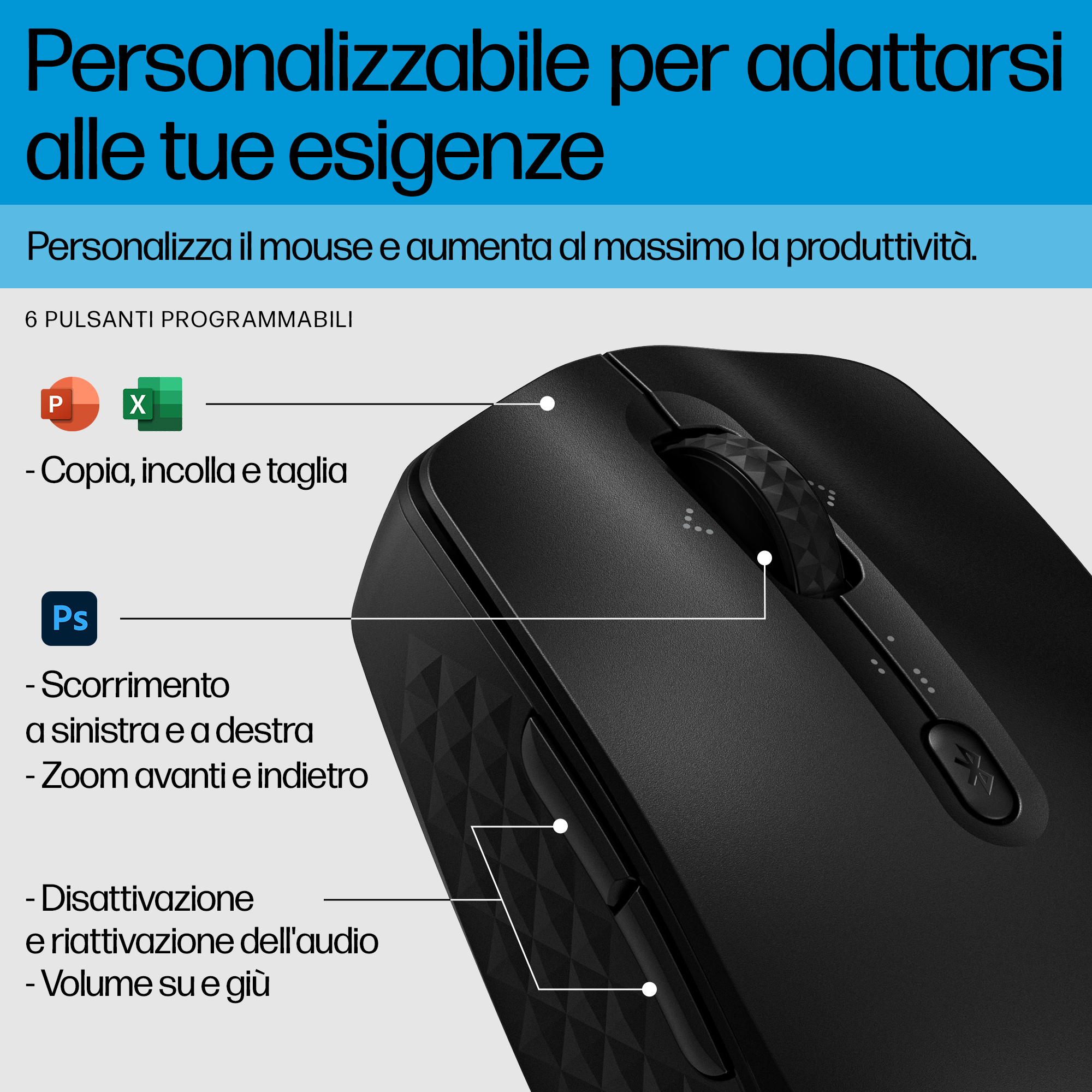 Personalizzate il mouse in base a specifiche esigenze. Basta scaricare l'app HP Accessory Center per programmare sei pulsanti<sup>[4]</sup> in base al proprio stile di lavoro per la massima produttività. La rotellina inclinabile in 4 direzioni semplifica lo scorrimento orizzontale.