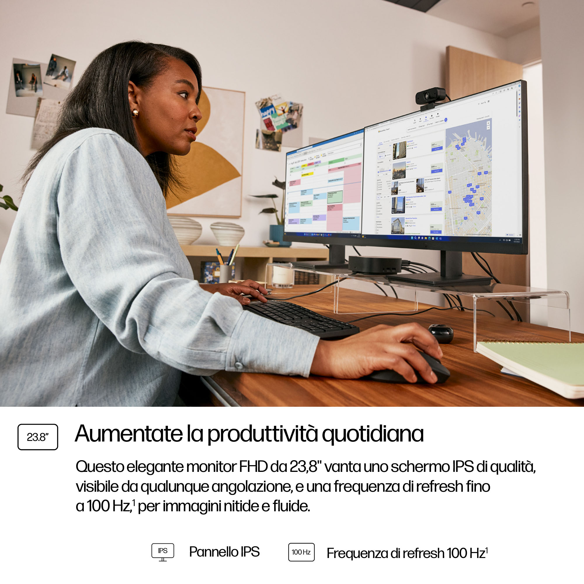Scegli un'esperienza di lavoro quotidiana più piacevole e produttiva, con tanto spazio in più per progetti e assegnazioni. Questo elegante monitor FHD da 23,8 pollici vanta uno schermo IPS di qualità, visibile da qualunque angolazione, e una frequenza di refresh fino a 100 Hz,<sup>[1]</sup> per immagini nitide e movimenti fluidi.