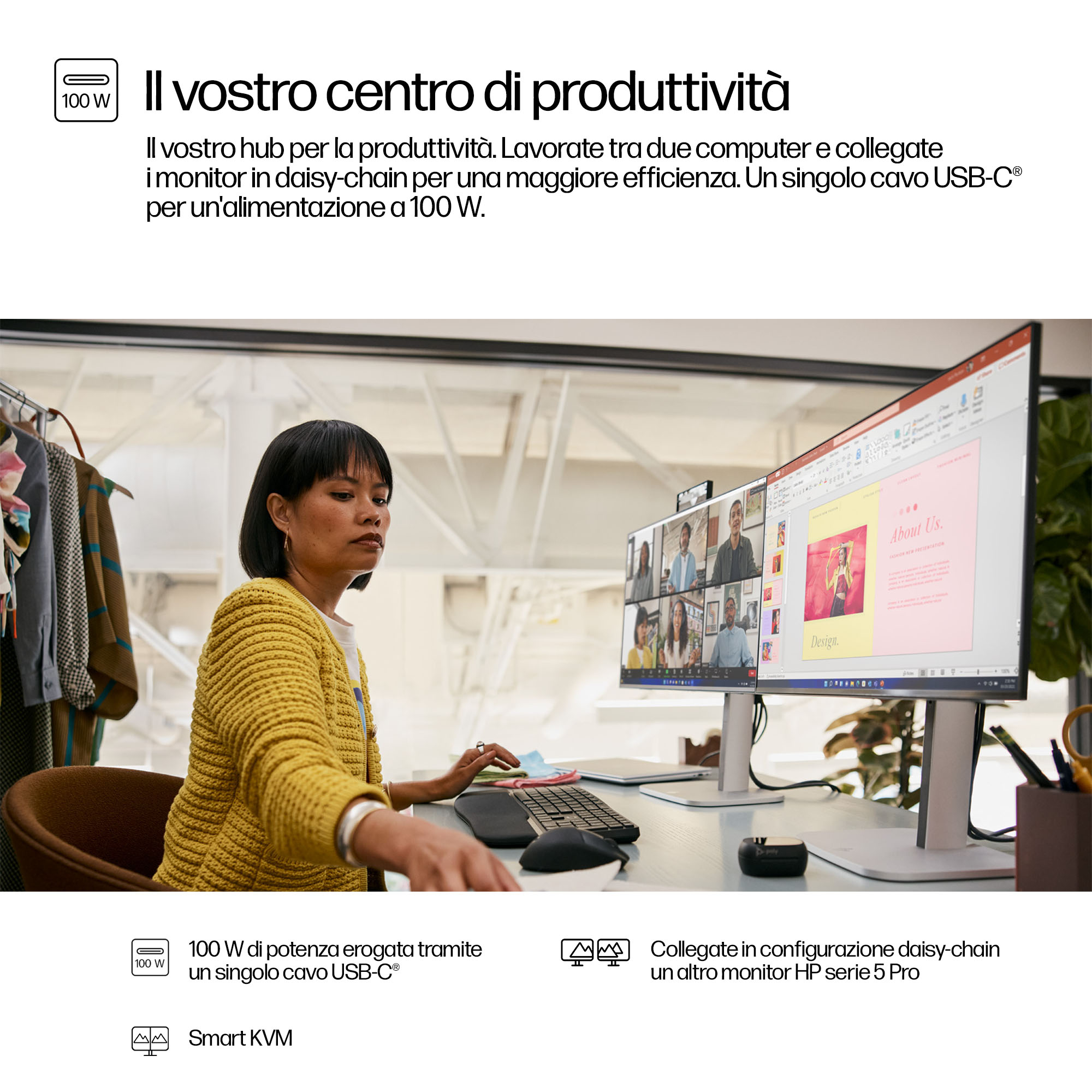 Trasforma questo monitor in un hub efficiente di produttività. Ora puoi lavorare facilmente tra due computer<sup>[2]</sup>, mentre un singolo cavo USB-C® fornisce 100 W di alimentazione. Aumenta la produttività con un doppio display e collegate un altro monitor HP serie 5 Pro in configurazione daisy-chain.<sup>[1]</sup>