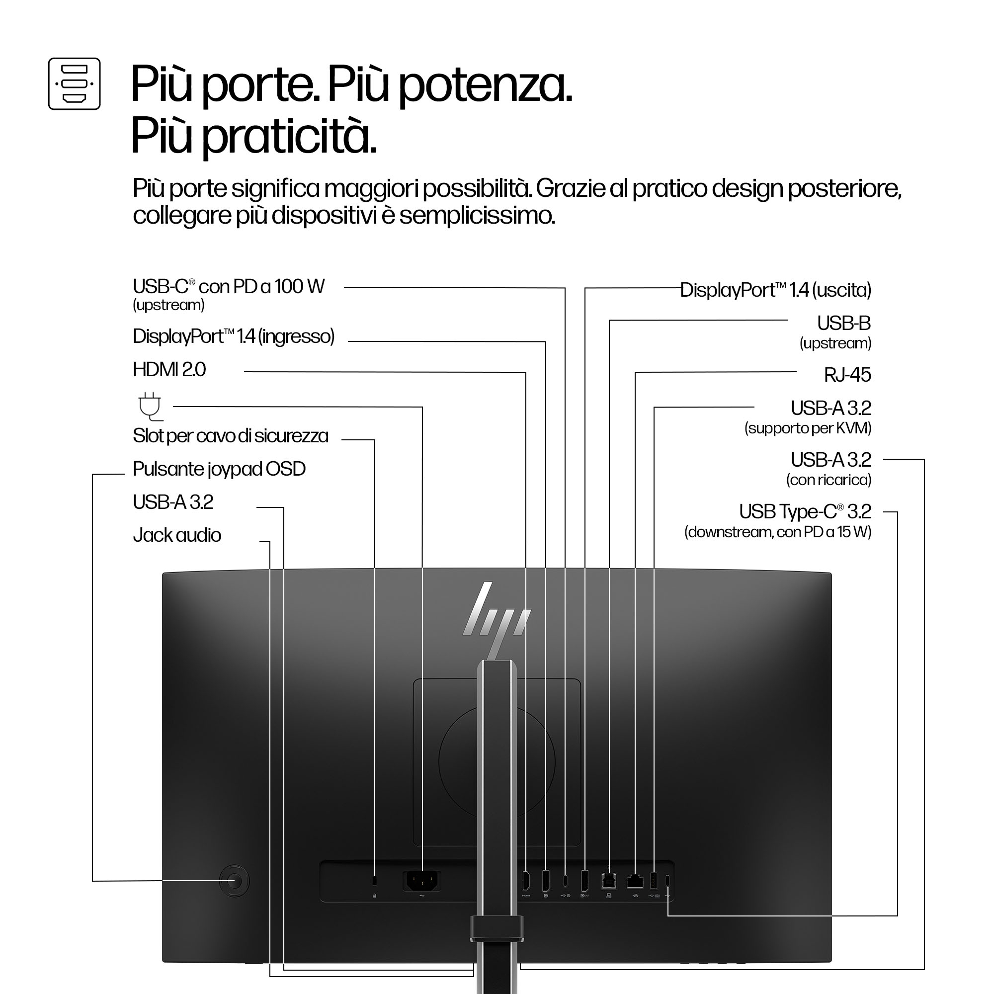 Più porte significa maggiori possibilità. Grazie alle porte HDMI 2.0, ingresso e uscita DisplayPort™ 1.4, USB-C® 3.2 (upstream), RJ-45, jack audio, USB-B (upstream) e 3 porte USB-A 3.2, è possibile collegare più dispositivi. Il design con le porte nella parte posteriore semplifica al massimo il collegamento.[10]