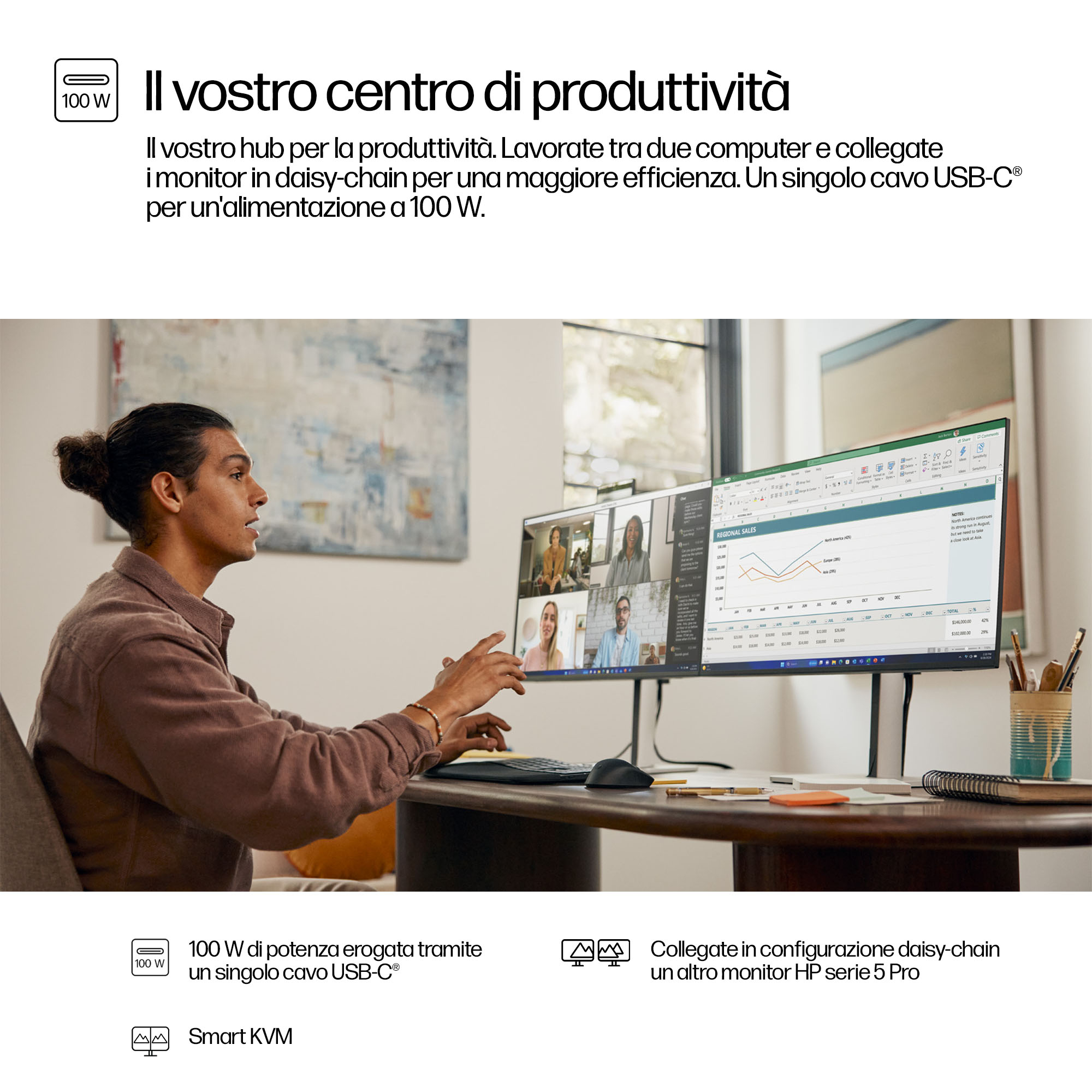 Trasforma questo monitor in un hub efficiente di produttività. Ora puoi lavorare facilmente tra due computer<sup>[2]</sup>, mentre un singolo cavo USB-C® fornisce 100 W di alimentazione. Aumenta la produttività con un doppio display e collegate un altro monitor HP serie 5 Pro in configurazione daisy-chain.<sup>[1]</sup>