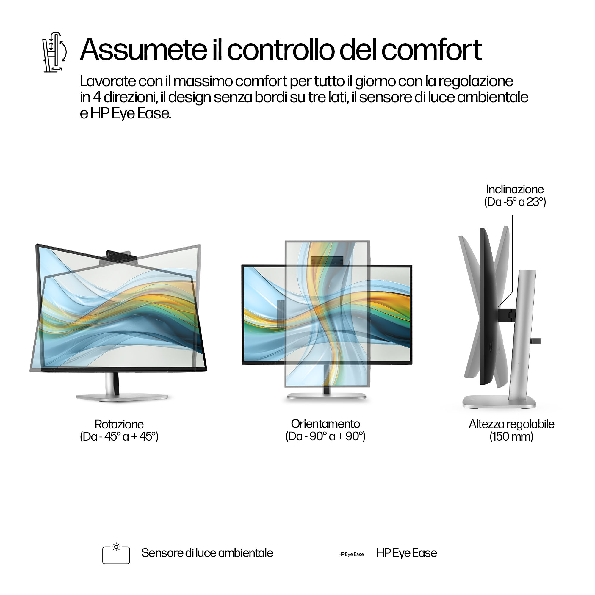Aumenta il comfort per tutto il giorno con la regolazione in 4 direzioni e l'elegante design senza bordi su 3 lati. Riduci l'affaticamento visivo grazie al sensore di luce ambientale e ad HP Eye Ease, che riduce la luce blu senza alterare il colore.