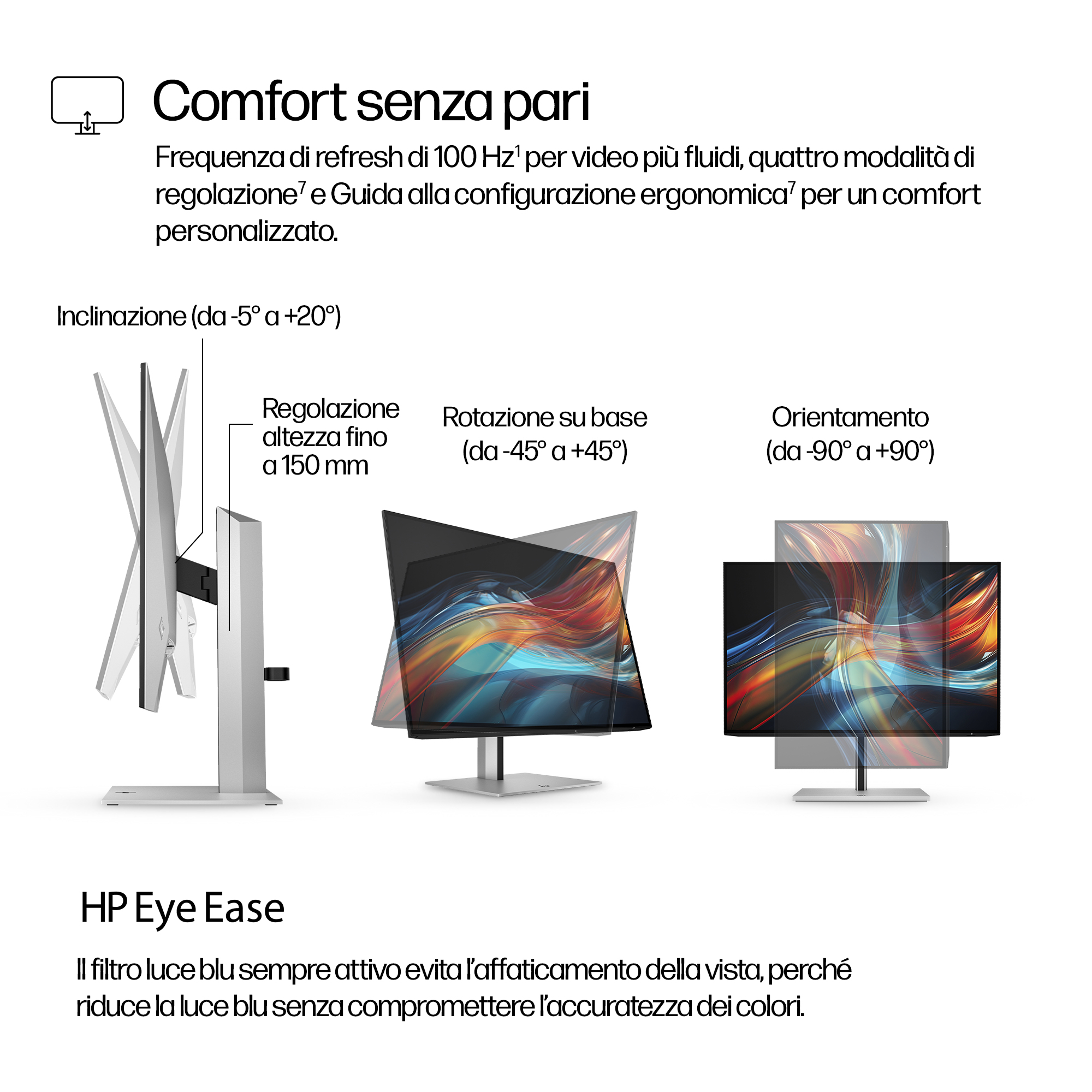 Massima comodità con il monitor che vi aiuta a fare di più durante la giornata. La frequenza di refresh di 100 Hz[1] rende confortevole il tempo trascorso davanti allo schermo, con uno scorrimento reattivo e senza interruzioni e una riproduzione video fluida, mentre la vostra concentrazione aumenta grazie alla tecnologia HP Eye Ease integrata che riduce l'emissione di luce blu e garantisce colori precisi e realistici. Comfort personalizzato con la regolazione ergonomica a quattro vie, possibile tramite un supporto regolabile in altezza di 150 mm con impostazioni di inclinazione, rotazione su base e rotazione su perno.