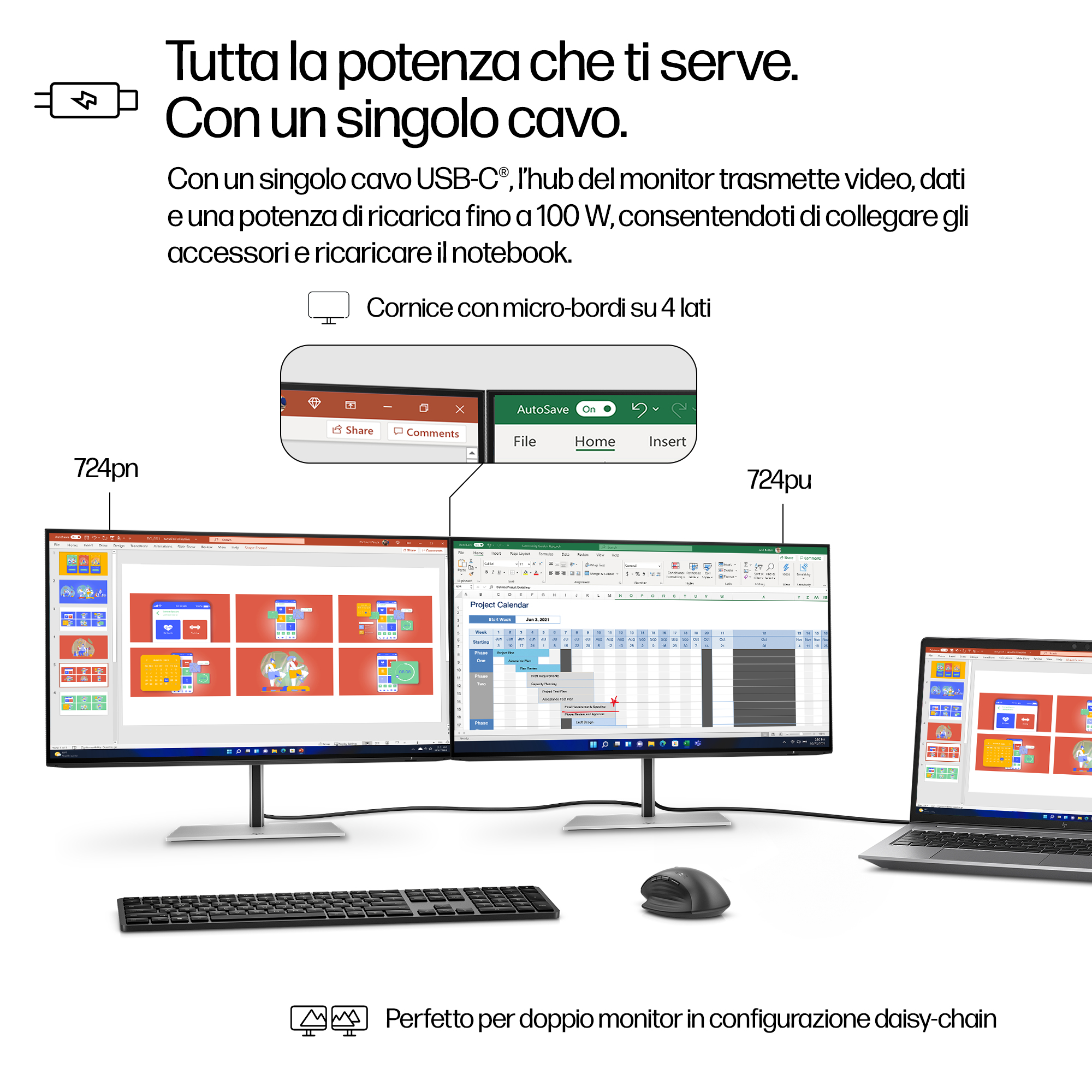Realizzato con la massima cura, con il suo elegante design aggiunge un tocco di stile al vostro ufficio o all'ambiente domestico, senza ingombrare la scrivania, grazie al suo profilo sottilissimo e alla connettività semplificata. Con un singolo cavo USB-C®, l'hub del monitor trasmette video, dati e una potenza di ricarica fino a 100 W, consentendovi di collegare gli accessori e ricaricare il laptop. Con una sottile cornice a micro-bordi su quattro lati e un'intuitiva connettività daisy-chain, consente di realizzare l'hub multi-monitor perfetto, con tanto spazio di lavoro in più.