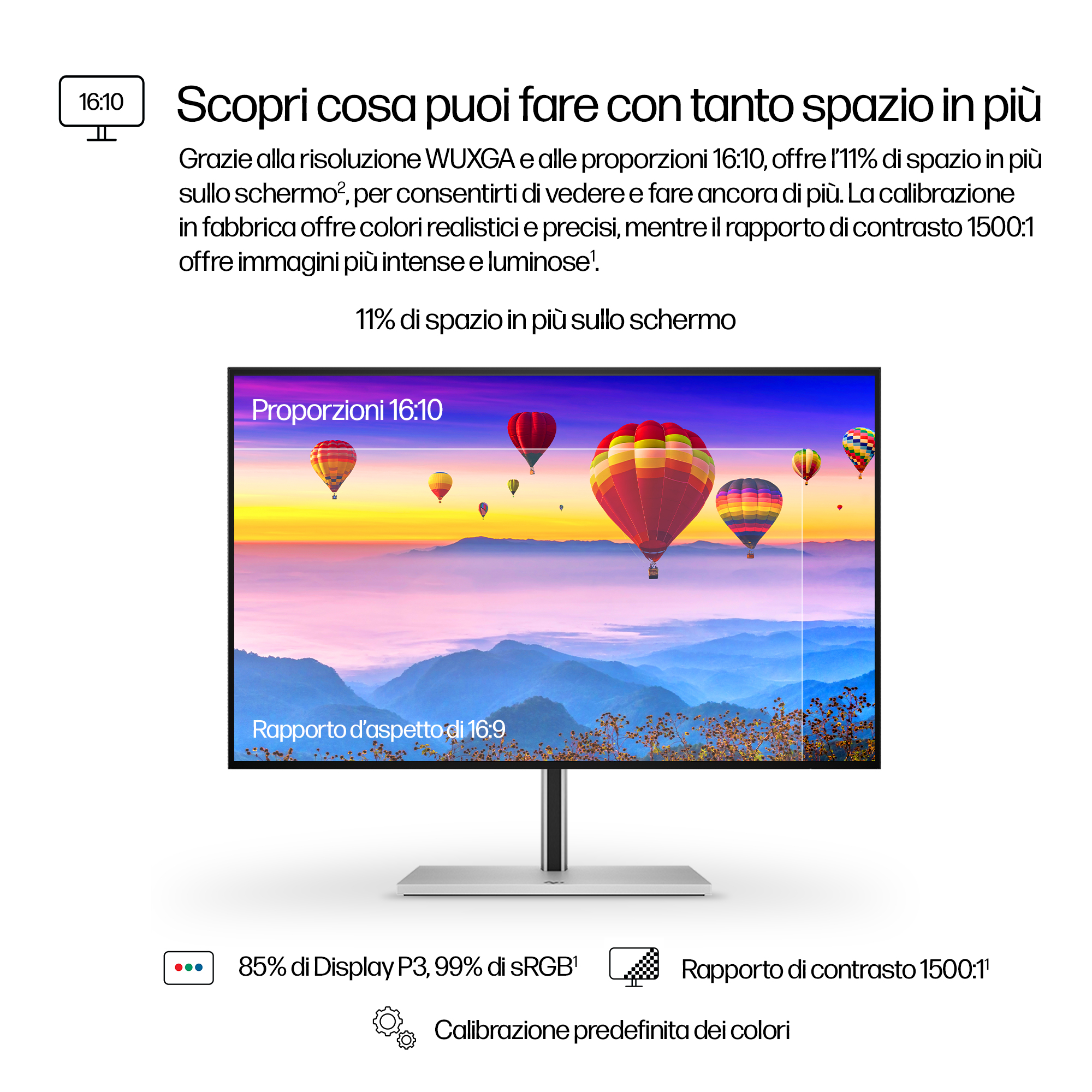 Con uno schermo più ampio, che offre colori intensi e precisi grazie alla calibrazione di fabbrica, il vostro spazio di lavoro fa un salto di qualità. Ogni dettaglio viene esaltato grazie alle ombreggiature più profonde e alla maggior luminosità offerte dal rapporto di contrasto 1500:1.[1] Con la copertura del 99% dello spazio colore sRGB, e dell'85% di Display P3, oltre alla calibrazione del colore in fabbrica, otterrete colori altamente realistici e precisi che rimangono uniformi da una schermo all’altro. Questo schermo, con risoluzione WUXGA e proporzioni 16:10, offre uno spazio più ampio dell'11%[2], per vedere e fare ancora di più.