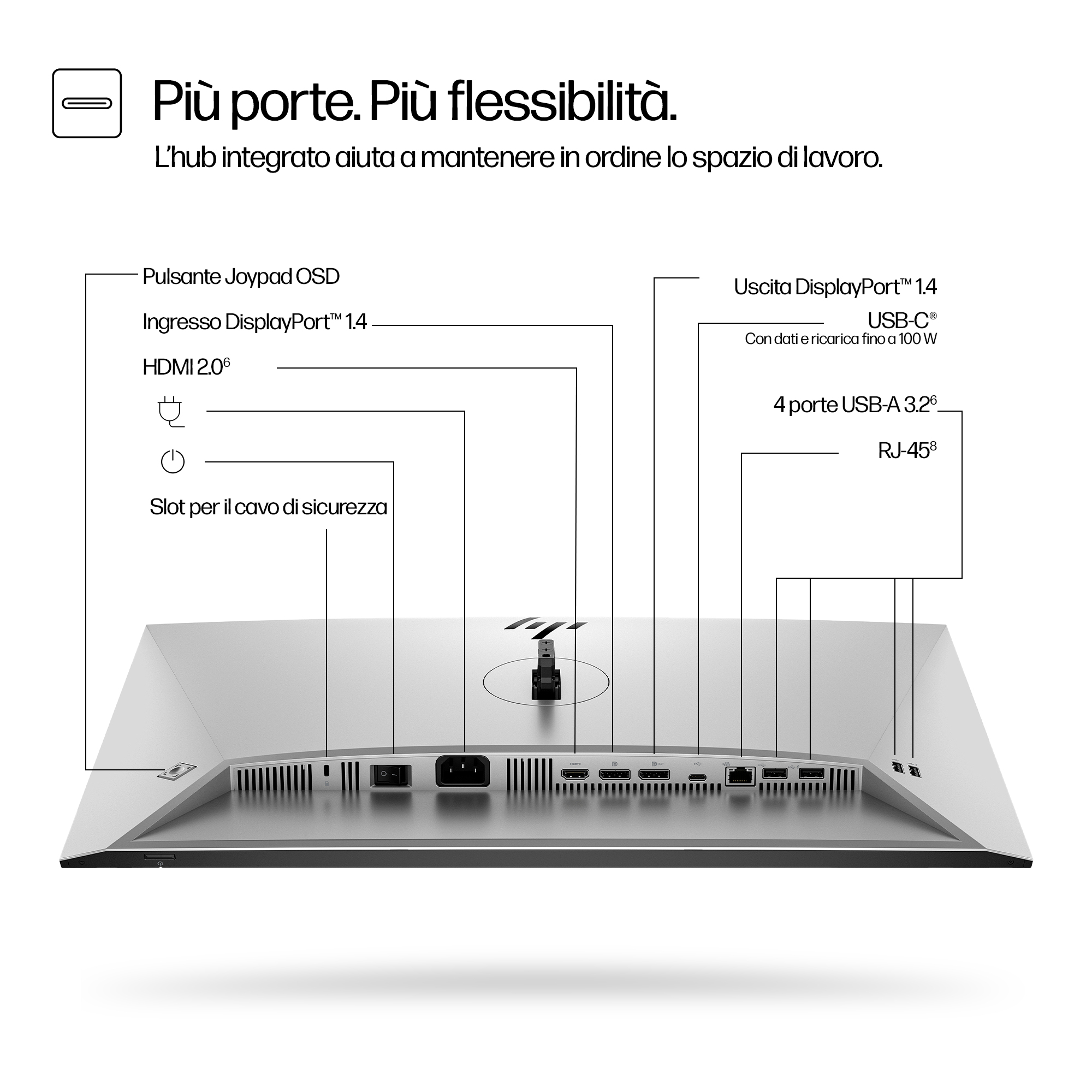 Più porte per maggiori funzionalità. Con una porta HDMI 2.0, 2 porte di ingresso/uscita DisplayPort™ 1.4, porte USB-C® e altre 4 porte USB-A 3.2, potete collegare o ricaricare più dispositivi contemporaneamente, come le cuffie e la webcam.[6]