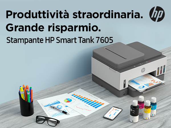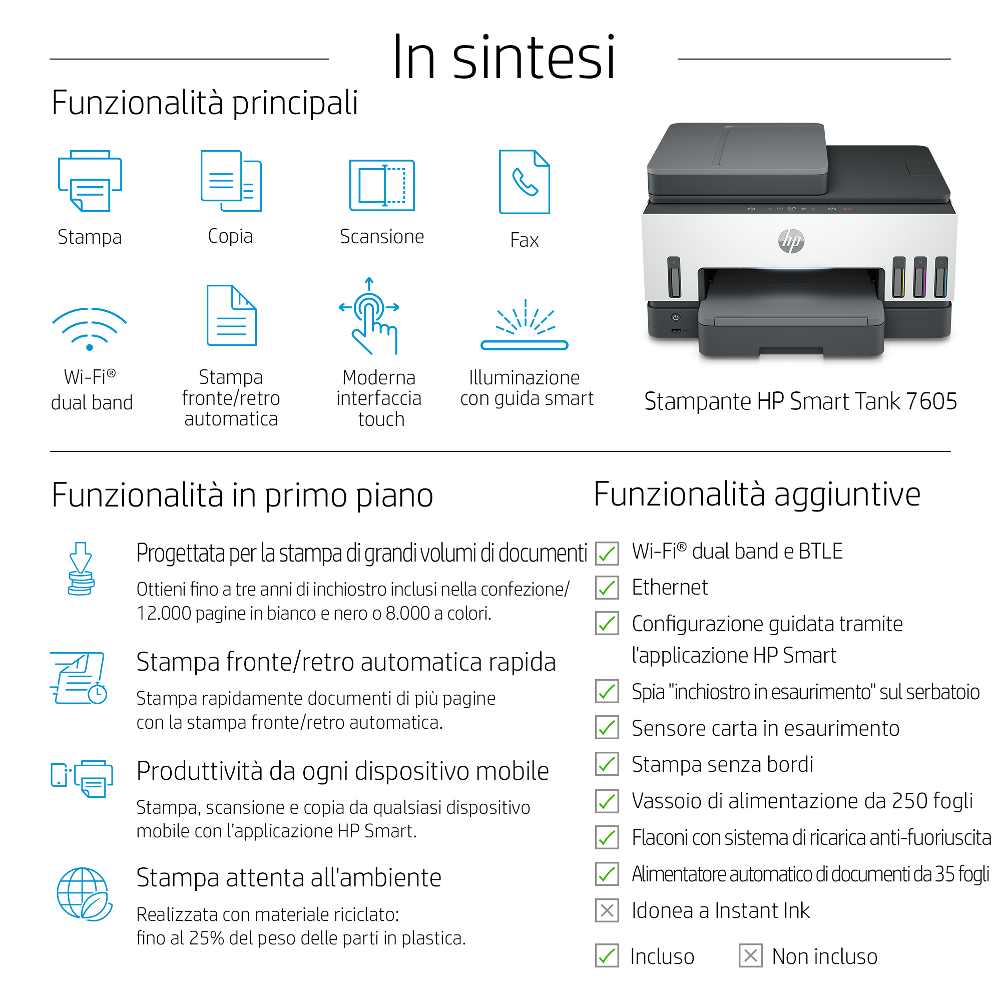 | Contenuto scatola | Stampante multifunzione HP Smart Tank 7605; 2 flaconi di inchiostro nero originale HP 32XL; flacone di inchiostro ciano originale HP 31; flacone di inchiostro magenta originale HP 31; flacone di inchiostro giallo originale HP 31; testina di stampa originale HP, nero; testina di stampa originale HP, tricromia; pieghevole contenente avvertenze sull'utilizzo dell'inchiostro; pieghevole per il reimballaggio; guida all'installazione; guida di riferimento; pieghevole sulla conformità normativa; pieghevole PT; pieghevole sulla conformità normativa RoH-EAC; cavo di alimentazione; pieghevole sulla garanzia estesa. Per maggiori informazioni sul riempimento e sulla resa consultare http://www.hp.com/go/learnaboutsupplies |