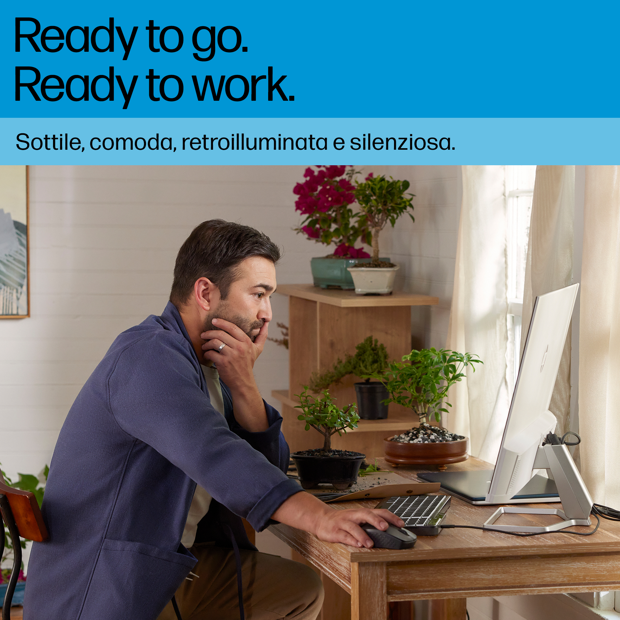 Passare dal lavoro a casa al lavoro in ufficio è facilissimo con questa tastiera sottile e comoda. Resistente a versamenti di liquidi, igienizzabile<sup>[1]</sup> e salvaspazio, è ideale per gli spostamenti e i viaggi. Quando ti trovi a lavorare fino a sera, goditi il suo caldo LED bianco e i tasti super silenziosi.