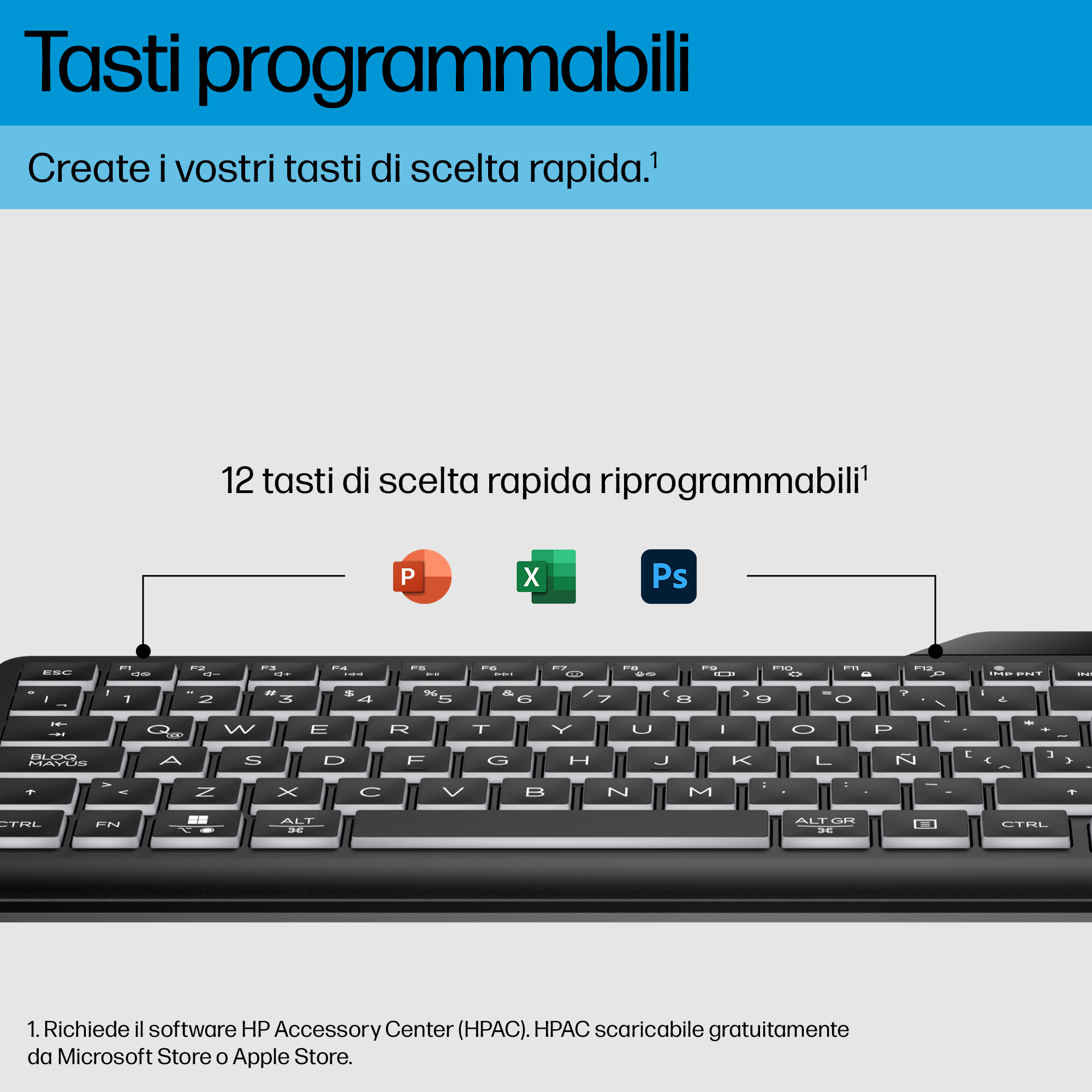 Con i tasti illuminati in bianco caldo, questa tastiera pronta all'uso rende la digitazione più efficiente ovunque. Collega il dispositivo e lavora al meglio con i tasti silenziosi e tre livelli di retroilluminazione LED. Aumenta ulteriormente la produttività con 12 tasti programmabili. Lavora e divertiti tutto il giorno con la tastiera cablata e retroilluminata HP 405, dal design sottile e igienizzabile[1].