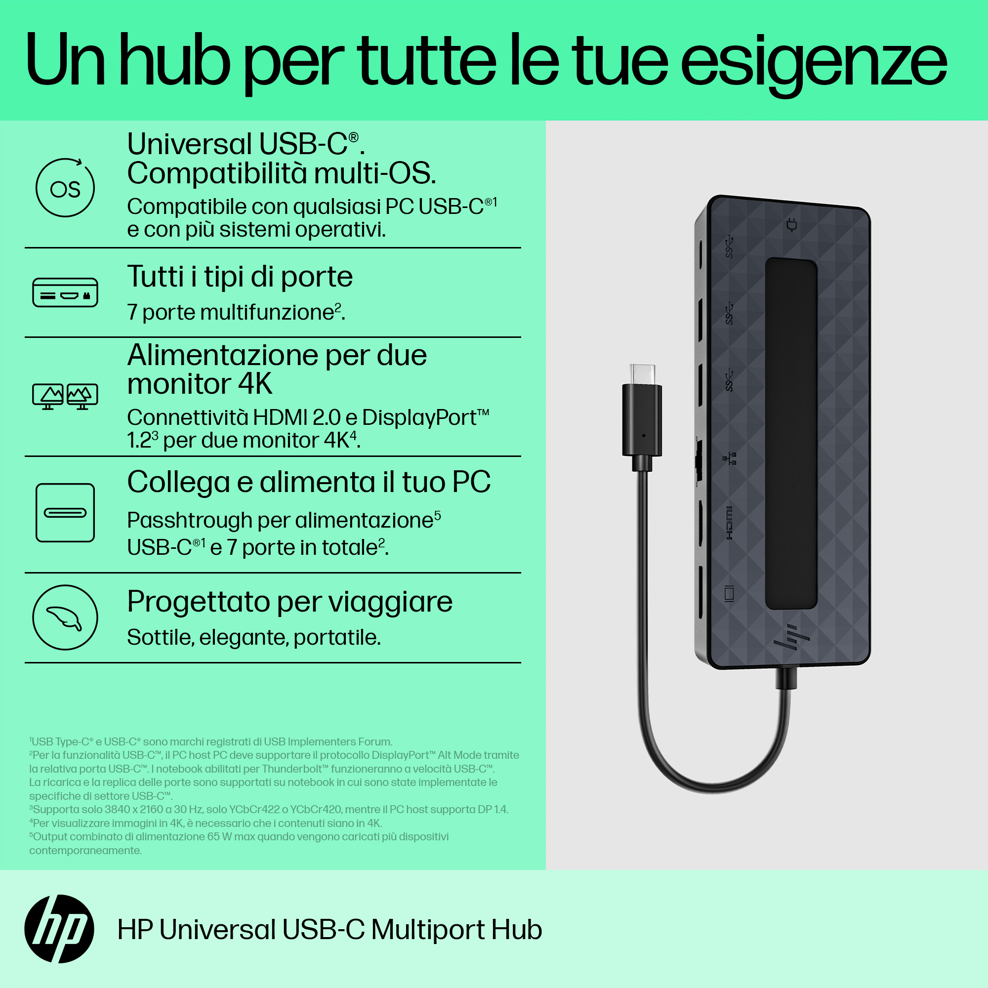 Accedete a un mondo di possibilità con HP Universal USB-C Multiport Hub, che ora supporta qualunque PC compatibile con USB-C[1]. 7 porte, 1 cavo passthrough per alimentazione e trasferimento e numerose porte per tutte le vostre esigenze. Supporta inoltre due monitor 4K[2] tramite HDMI 2.0 e 1 DisplayPort™ 1.2. Tutto il necessario per restare connessi in un unico hub.
