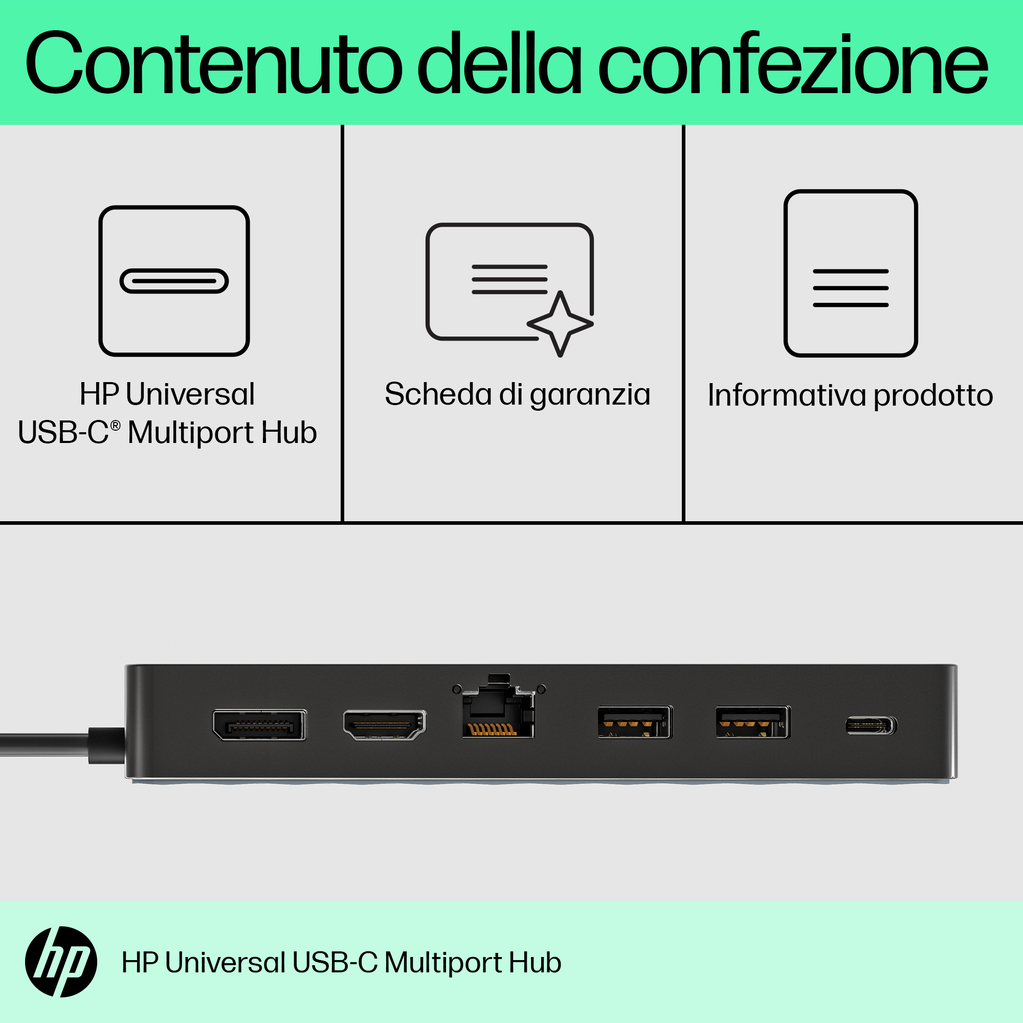 | Contenuto scatola | Hub multiporta USB-C universale HP; informativa prodotto; garanzia |