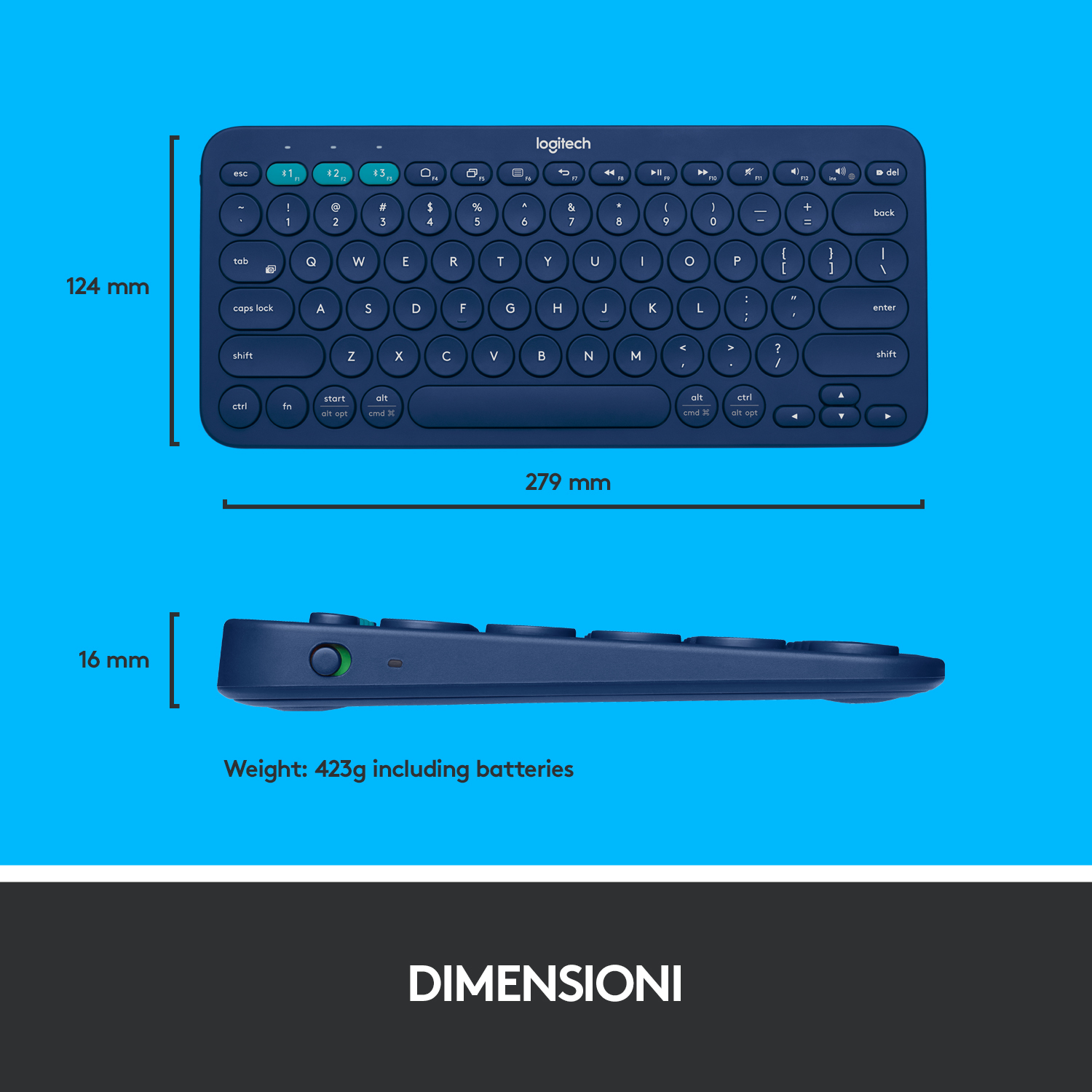 | Dimensioni tastiera (WxDxH) | 279,5 x 124,2 x 16,4 mm |