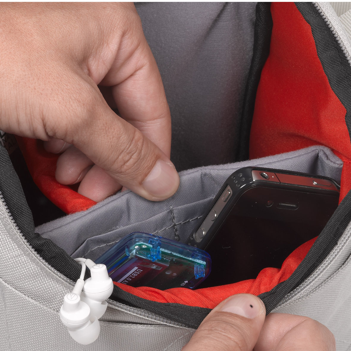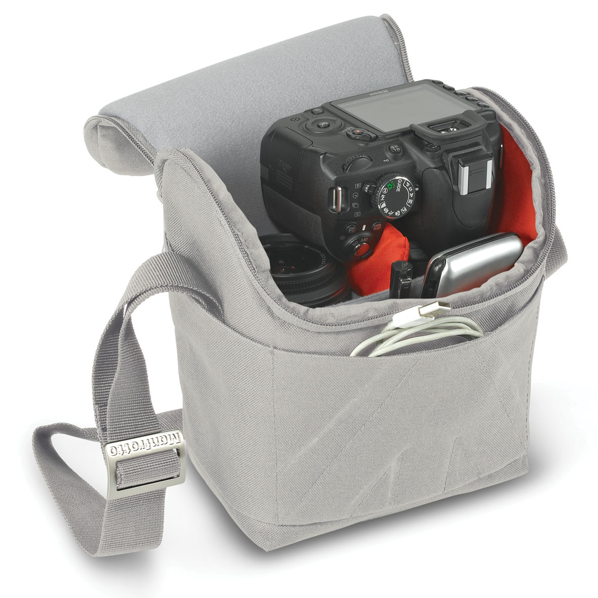 L'Amica-10 è una borsa a spalla pratica, divertente e protettiva capace di contenere una mirrorless con lente montata, più una lente pancake aggiuntiva e piccoli accessori.