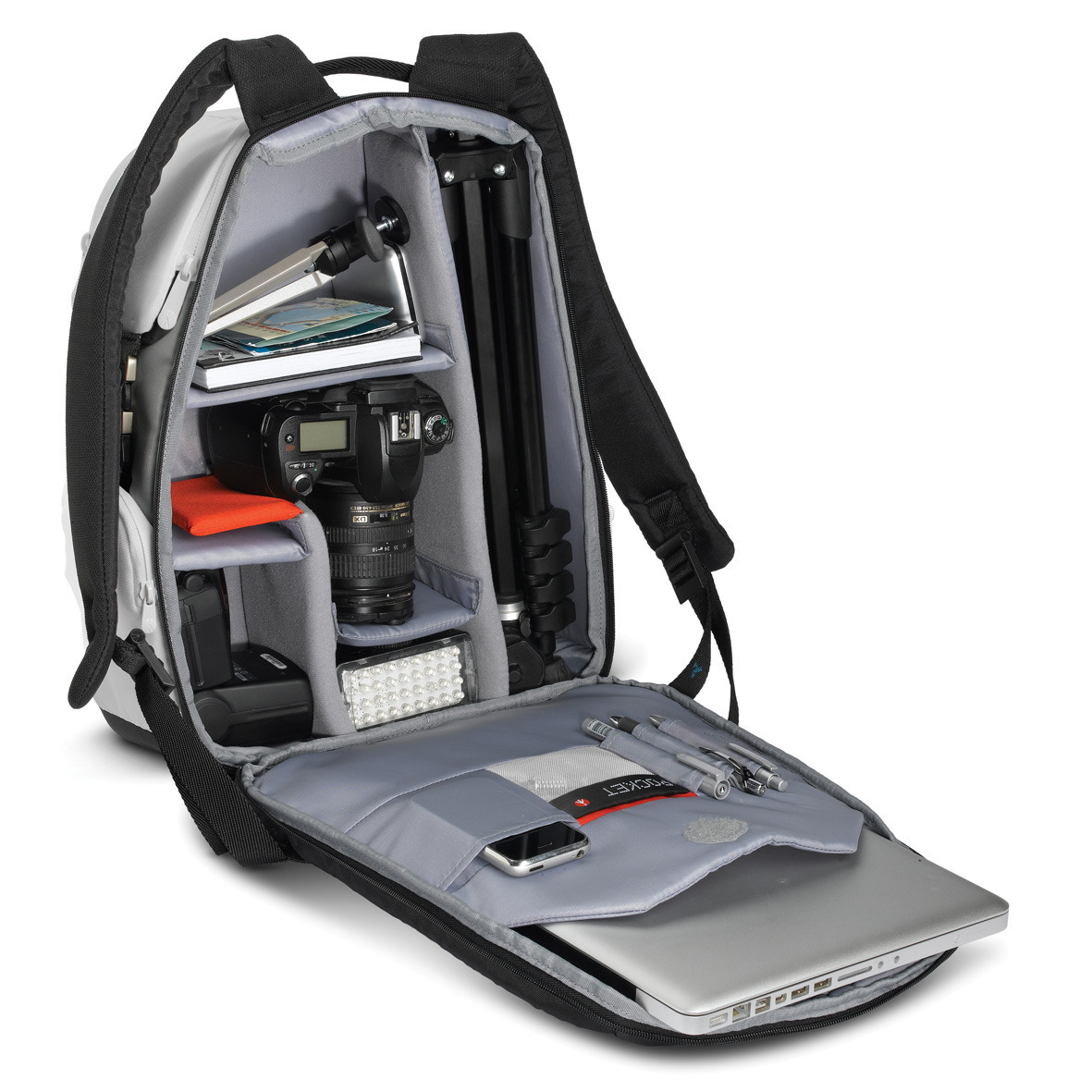 Lo zaino Veloce V può contenere in modo confortevole il corredo fotografico e un treppiedi (sia all'interno che all'esterno) e un PC portatile da 15.4'' (Macbook da 17''). Accedi attraverso l'apertura superiore alla tua reflex con battery pack e obiettivo fino a 70-200mm montati senza dover aprire completamente la borsa. 2-3 obiettivi addizionali, flash e altri accessori trovano invece posto nel comparto inferiore.