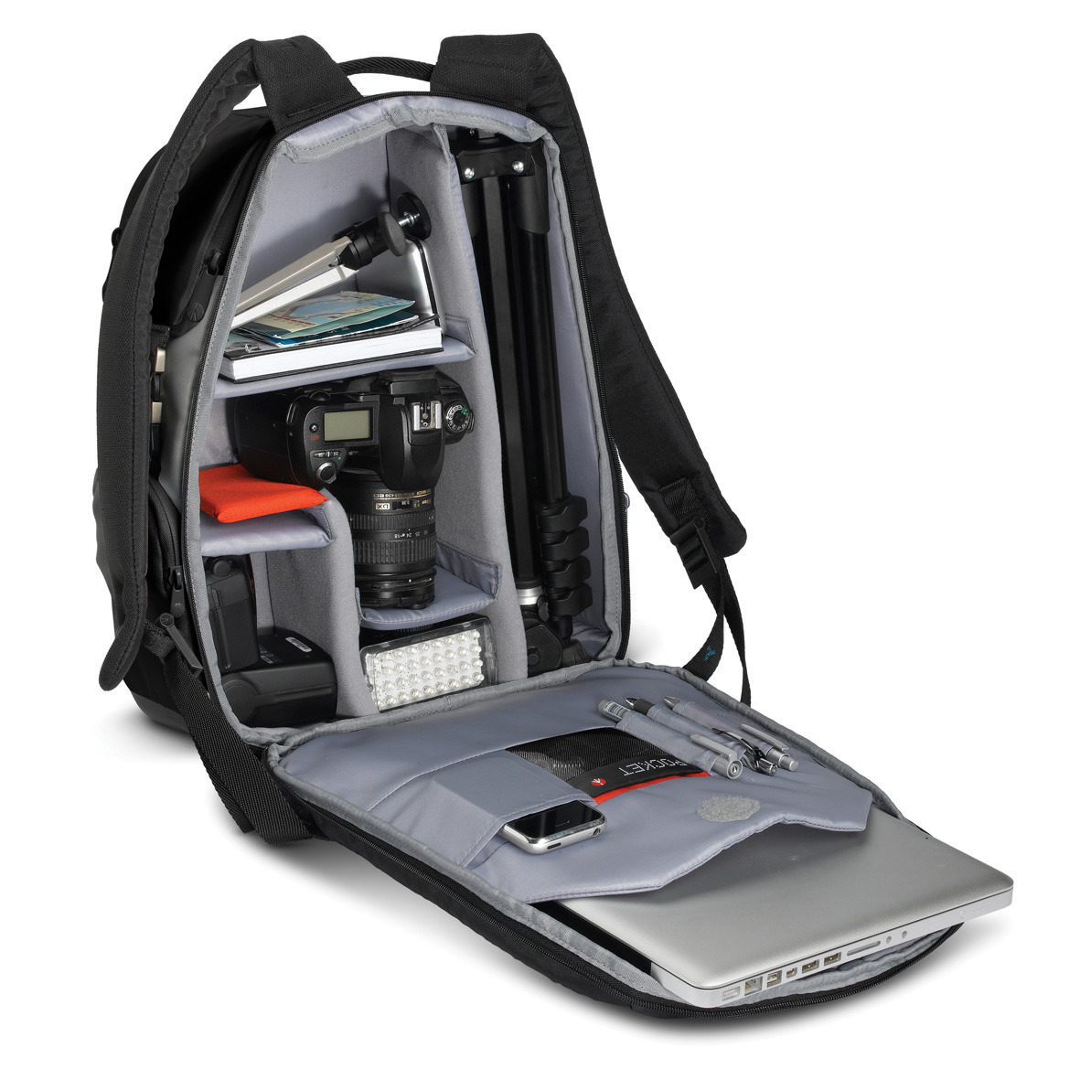 Lo zaino Veloce V può contenere in modo confortevole il corredo fotografico e un treppiedi (sia all'interno che all'esterno) e un PC portatile da 15.4'' (Macbook da 17''). Accedi attraverso l'apertura superiore alla tua reflex con battery pack e obiettivo fino a 70-200mm montati senza dover aprire completamente la borsa. 2-3 obiettivi addizionali, flash e altri accessori trovano invece posto nel comparto inferiore.