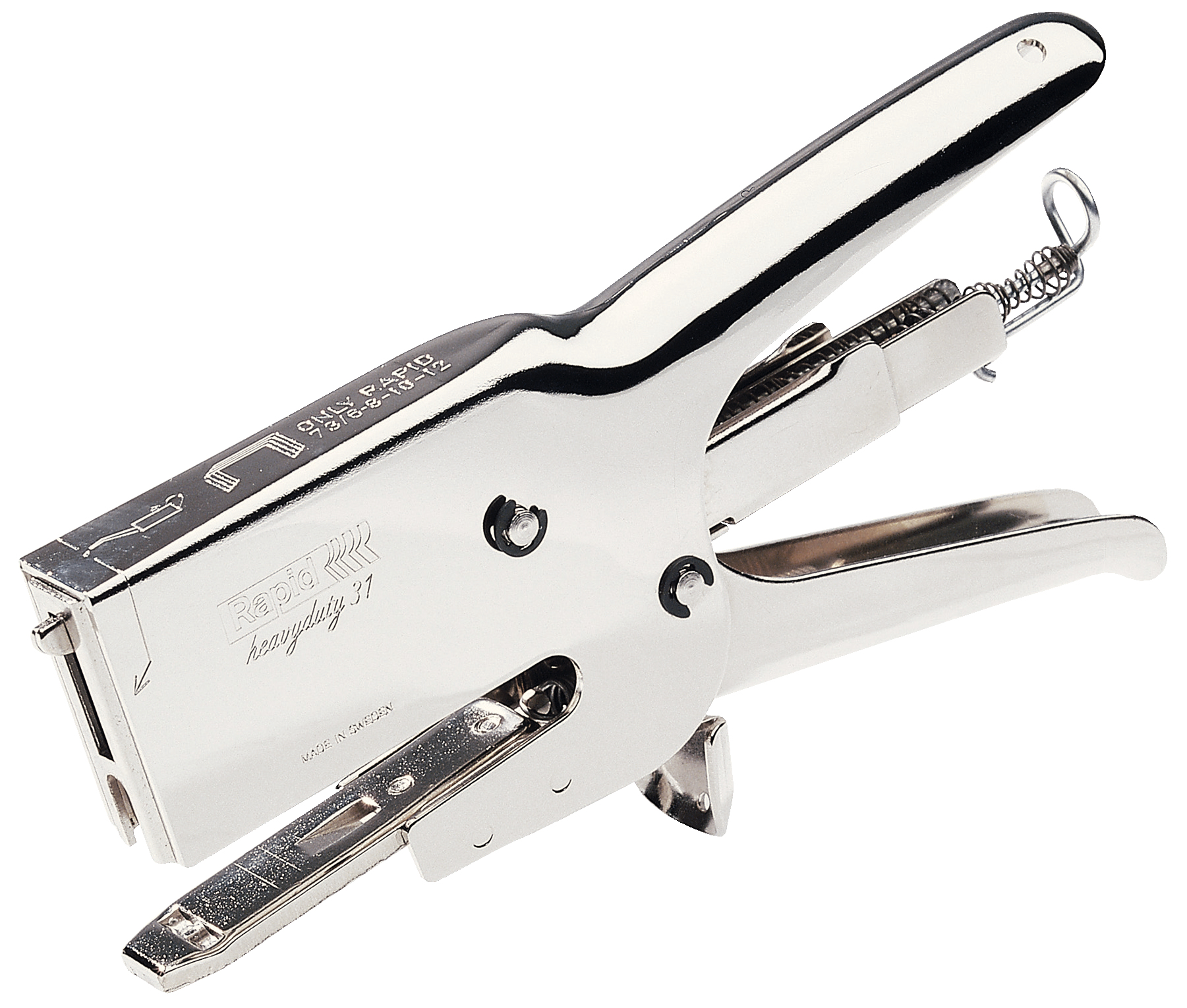 Efficiente cucitrice a pinza con superficie placcata al nichel e protezione salvadita, ideale per buste imbottite, piccole scatole ecc. Funziona con 3 tipi di ribattitore che si fissano facilmente con 2 viti.