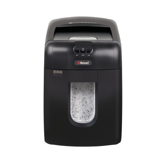 Rexel Auto+ 130M. Volume cestino: 26 L, Emissione acustica: 60 dB, Capacità di affettamento: 140 fogli. Larghezza: 312 mm, Profondità: 448 mm, Altezza: 430 mm. Larghezza imballo: 374 mm, Profondità imballo: 509 mm, Altezza imballo: 491 mm