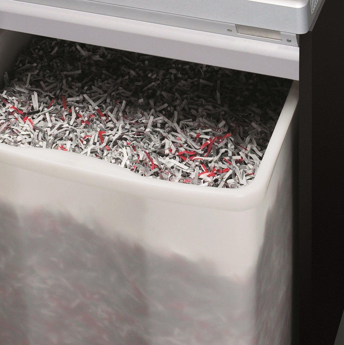 Ideale per la distruzione di grandi volumi, il distruggidocumenti ad ampia imboccatura fornisce un livello di sicurezza sufficiente per ridurre documenti riservati in piccoli frammenti. Gestisce fino a 25 fogli A4 per volta e l`ampia entrata accetta fino al formato A3. È dotato di un cestino rimovibile di plastica da 175 litri con blocco automatico a cestino pieno o sportello aperto.