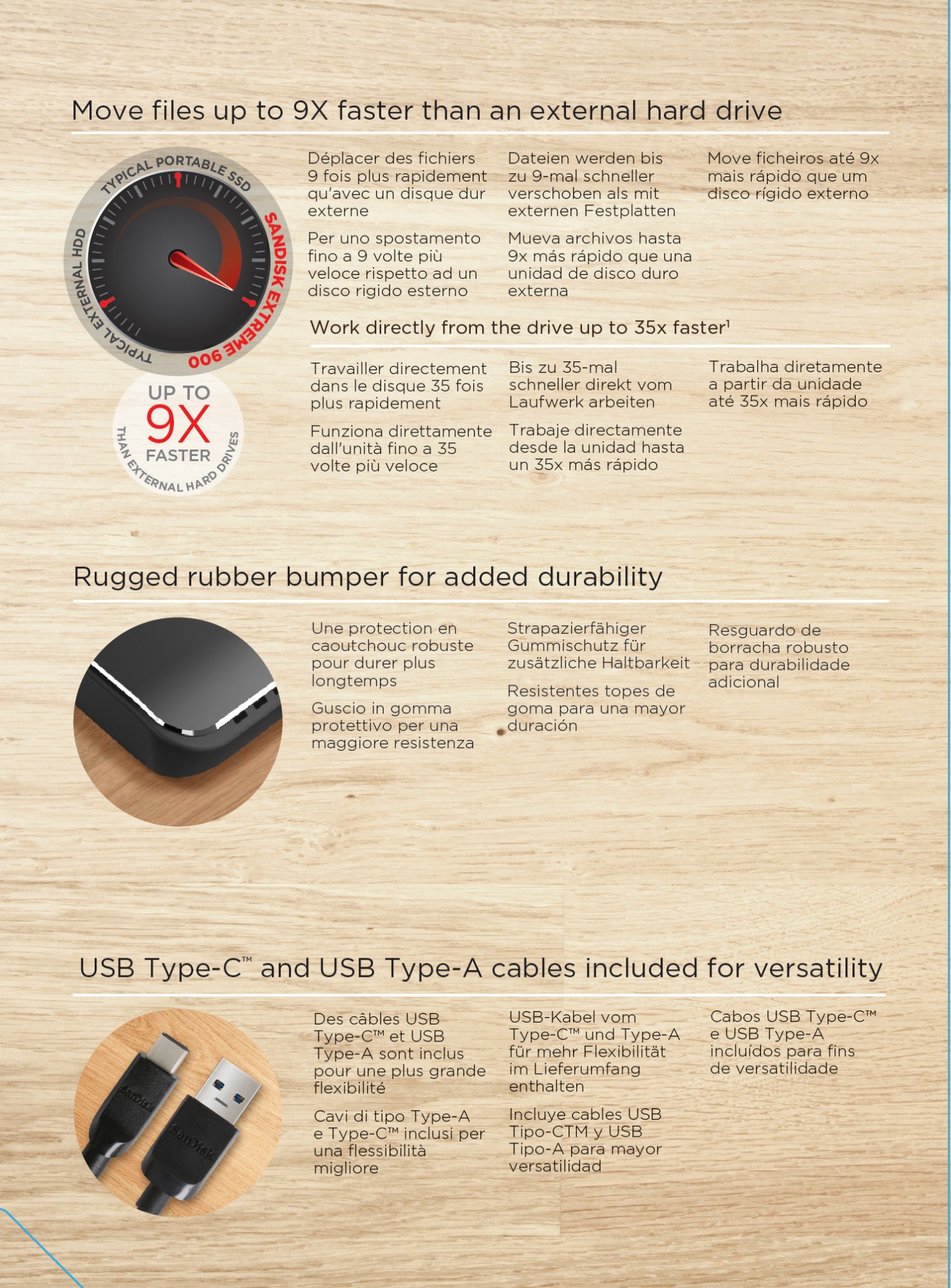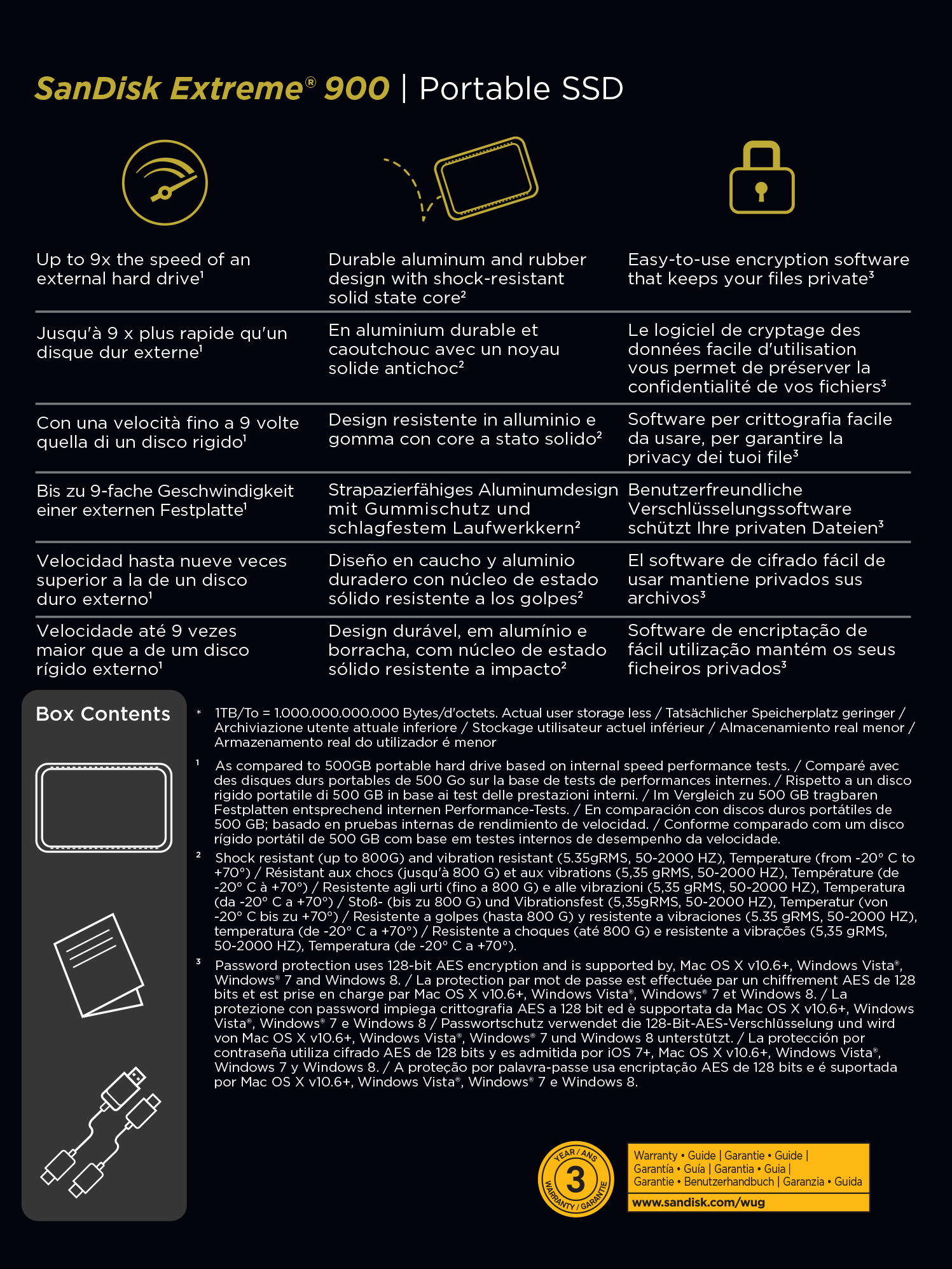 Desiderate elevate velocità di memorizzazione per foto, video e file? L'unità SSD Portatile SanDisk Extreme 900 offre velocità fino a 9 volte superiori a quelle di un disco rigido portatile2 ed è disponibile con capacità fino a 1,92 TB1 per trasferire i vostri file di grandi dimensioni in pochi secondi. Lavorare direttamente sull’unità è inoltre più efficiente grazie ai tempi di accesso più brevi. Con la tecnologia dello stato solido, non vi sono parti mobili che possono spezzarsi o surriscaldarsi. Il software di crittografia SanDisk SecureAccess™ mantiene privati i vostri file3. Quando il vostro lavoro dipende dagli strumenti utilizzati, affidatevi al marchio su cui tutti i professionisti contano e scegliete l'unità SSD POrtatile SanDisk Extreme 900.